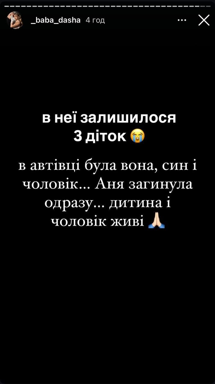 "Сьогодні світ забрав дуже світлу і добру людину, Анічку. Серце розривається, троє синів залишилися без мами. Я не знала Аню особисто, але вона три роки відписувала мені на сторіз, підтримувала, коли блокували сторінки й навіть радила, які памперси кращі. Дуже шкода. Цінуймо кожен день. Ніколи не знаєш, коли вийдеш з дому і більше не повернешся", – написала блогерка.