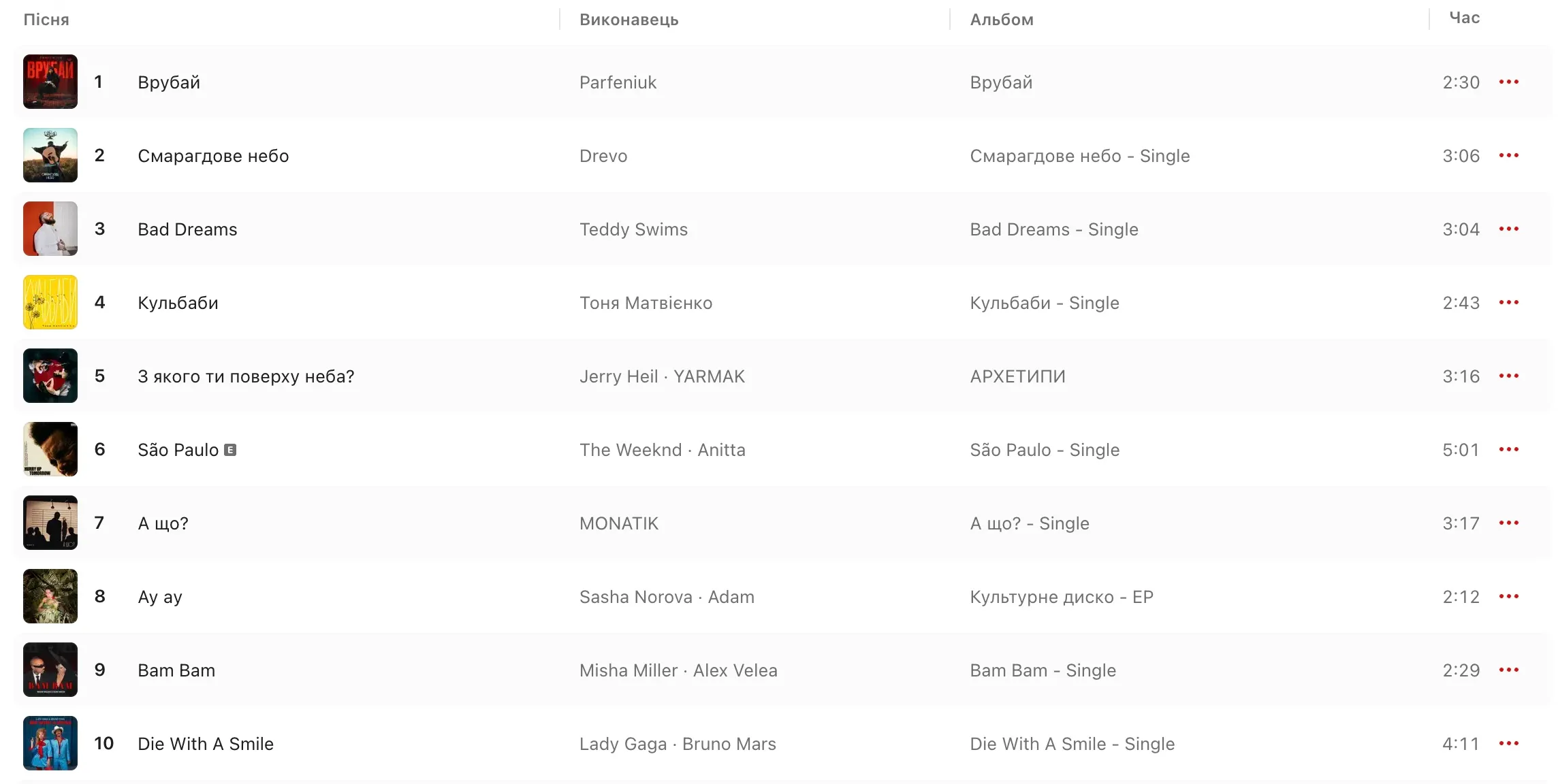 Топ-10 найпопулярніших пісень / Скриншот з Apple Music