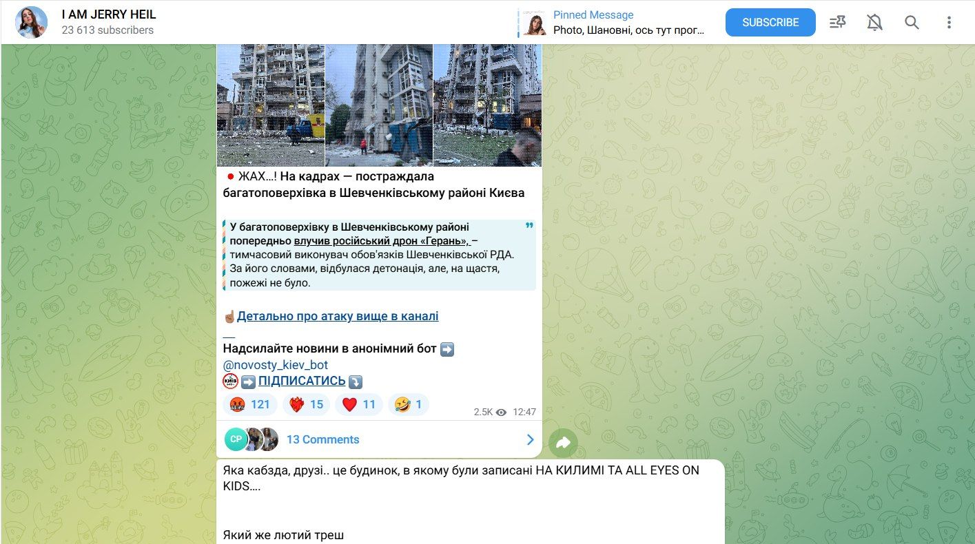 Росія влучила у багатоповерхівку в Шевченківському районі Києва. На опублікованих фото та відео видно, що будинок постраждав, зокрема вибиті вікна. Jerry Heil розповіла, що саме там записували одні зі своїх пісень.