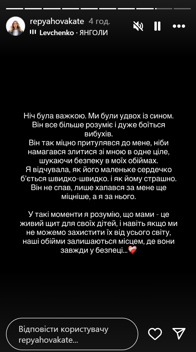 Він (Син – 24 Канал) все більше розуміє та дуже боїться вибухів. Він так міцно притулявся до мене, ніби намагався злитися зі мною в одне ціле, шукаючи безпеку в моїх обіймах. Я відчувала, як його маленьке сердечко б'ється швидко-швидко. І як йому страшно. У такі моменти я розумію, що мами – це живий щит для своїх дітей, і навіть якщо ми не можемо захистити їх від усього світу, наші обійми залишаються місцем, де вони завжди у безпеці,