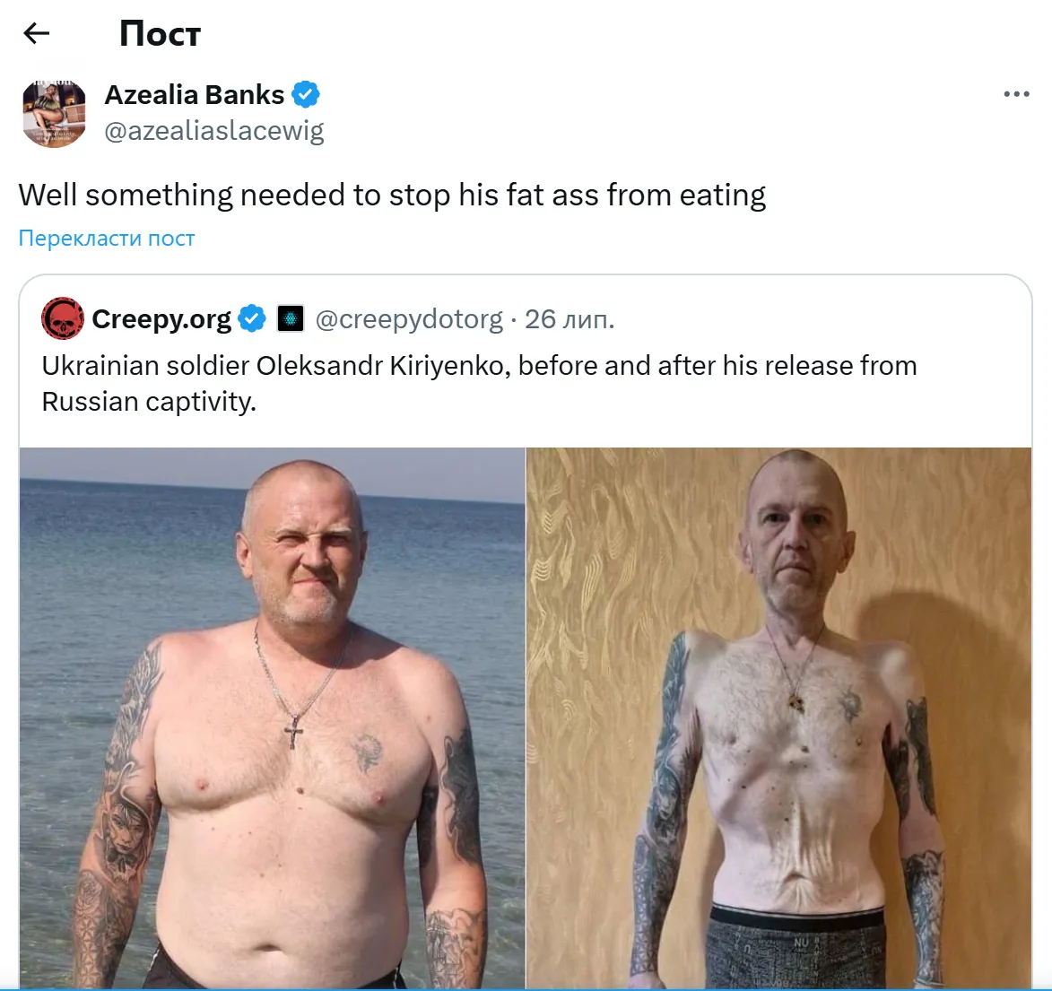 Бенкс зробила репост колажу з фото військового – до і після полону – додавши принизливий коментар: "Щось мало зупинити його товсту д*пу від їжі"