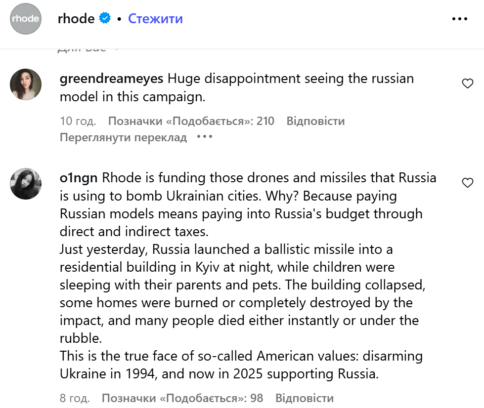 Бренд Rhode розкритикували через те, що вони співпрацювали з російською моделлю / Скриншоти з інстаграму