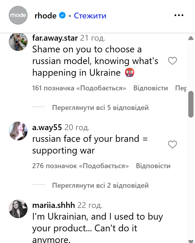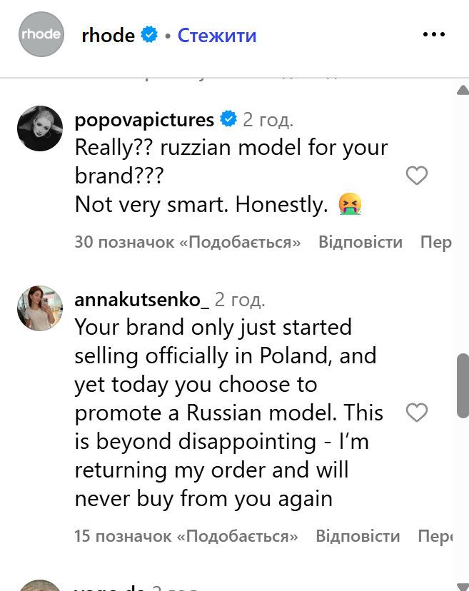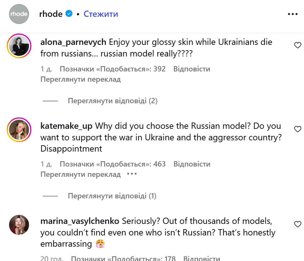 У коментарях в соцмережах користувачі активно висловлюють обурення через те, що обличчям рекламної кампанії стала російська модель. На їхню думку, це видається як підтримка Росії під час війни. Люди наголошують, що гроші, виплачені моделі, можуть частково потрапляти до бюджету Росії через податки. Через це чимало користувачів закликають до бойкоту Rhode і відмови від покупок продукції бренду.