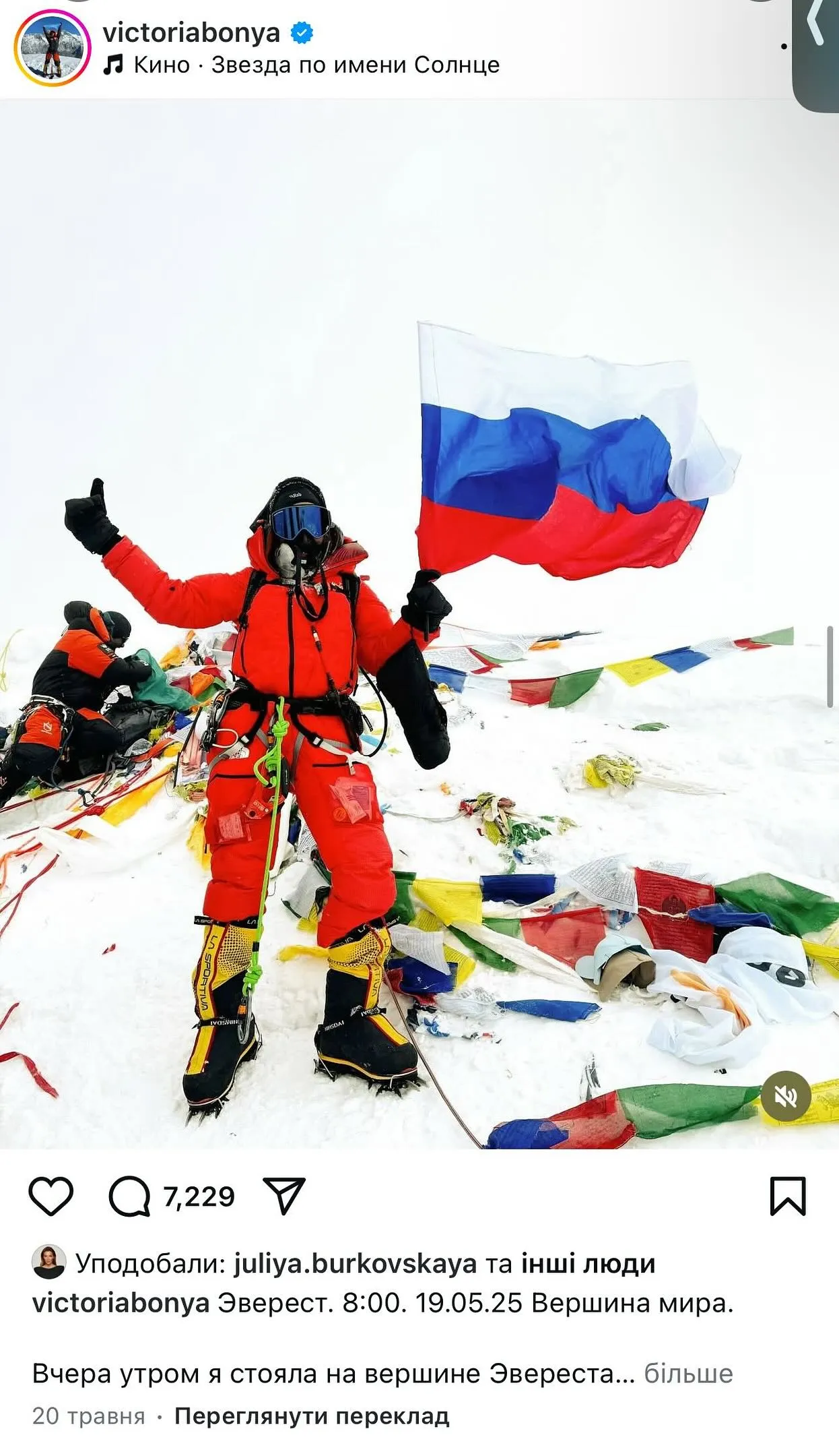 Дівчина звернула увагу на те, що під дописом російської блогерки та путіністки Вікторії Боні, яка підняла прапор країни-агресорки на вершині Евересту, стоїть вподобання від співзасновниці українського бренду Sister's Aroma Юлії Бурковської.