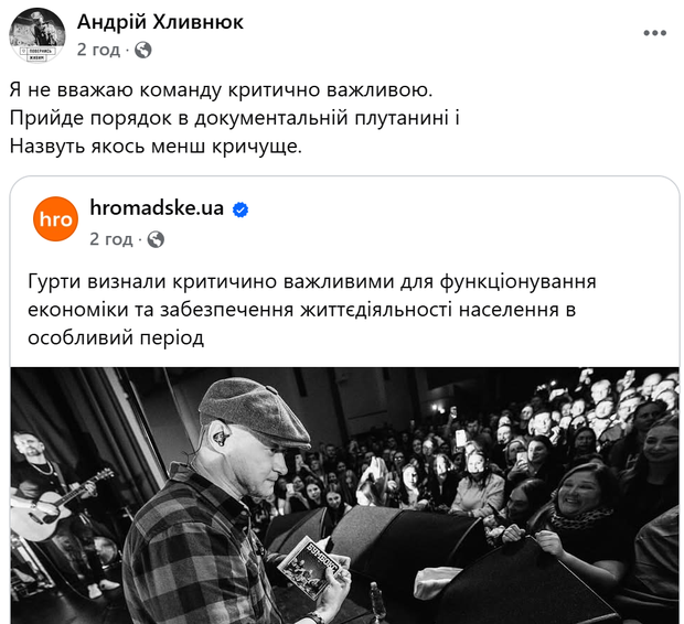 Андрій Хливнюк відреагував на новину, що "Бумбокс" отримав статус критичного важливого для України / Скриншот з фейсбуку