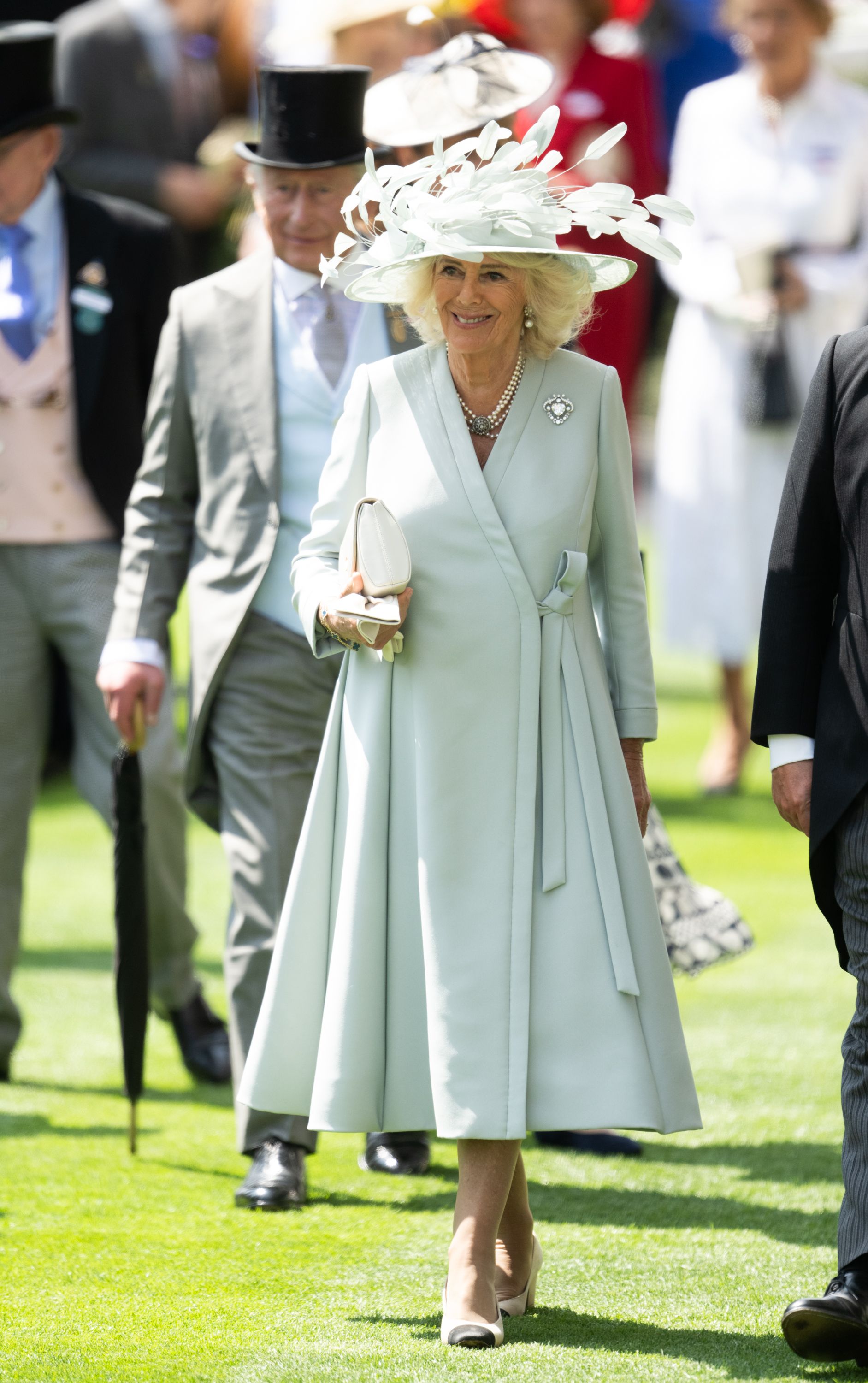 Король Чарльз III з'явився в сірому костюмі-трійці та чорному капелюсі-циліндрі. Королева Камілла обрала світло-зелену сукню-пальто від Dior та капелюх від Philip Treacy, взула туфлі на низьких підборах. Свій образ вона доповнила брошкою у вигляді серця з діамантом Cullinan і кольє, а в руках тримала клатч.