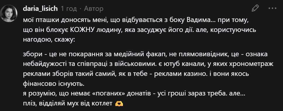 Збори – не покарання за медійний факап, не плямовивідник, це – ознака небайдужості та співпраці з військовими. Є ютуб канали, у яких хронометраж реклами зборів такий самий, як в тебе – реклами казино. І вони якось фінансово існують. Я розумію, що немає "поганих" донатів – усі гроші зараз треба. Але, пліз, відділяй мух від котлет,