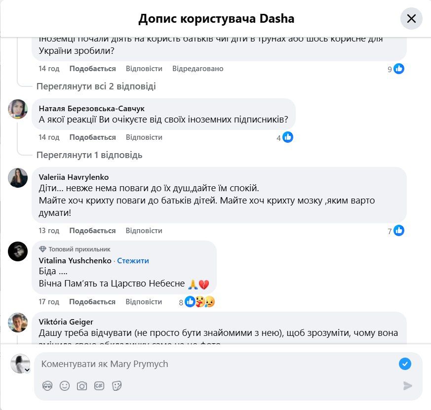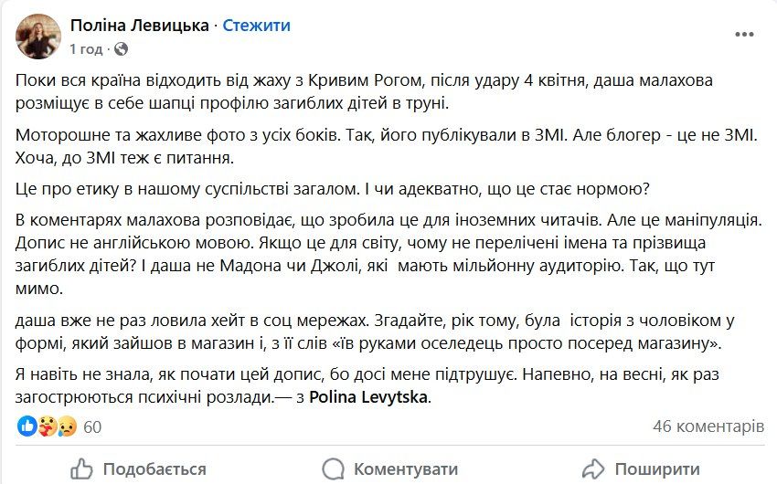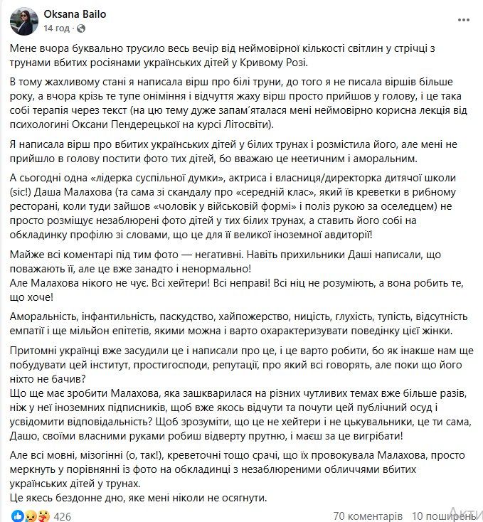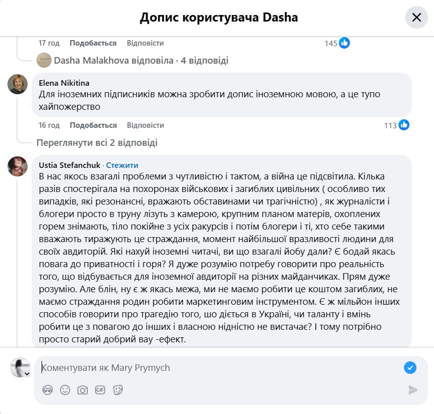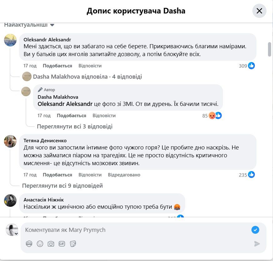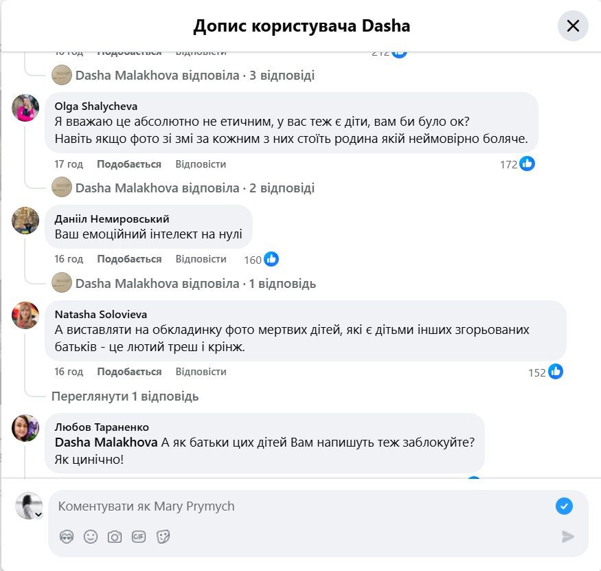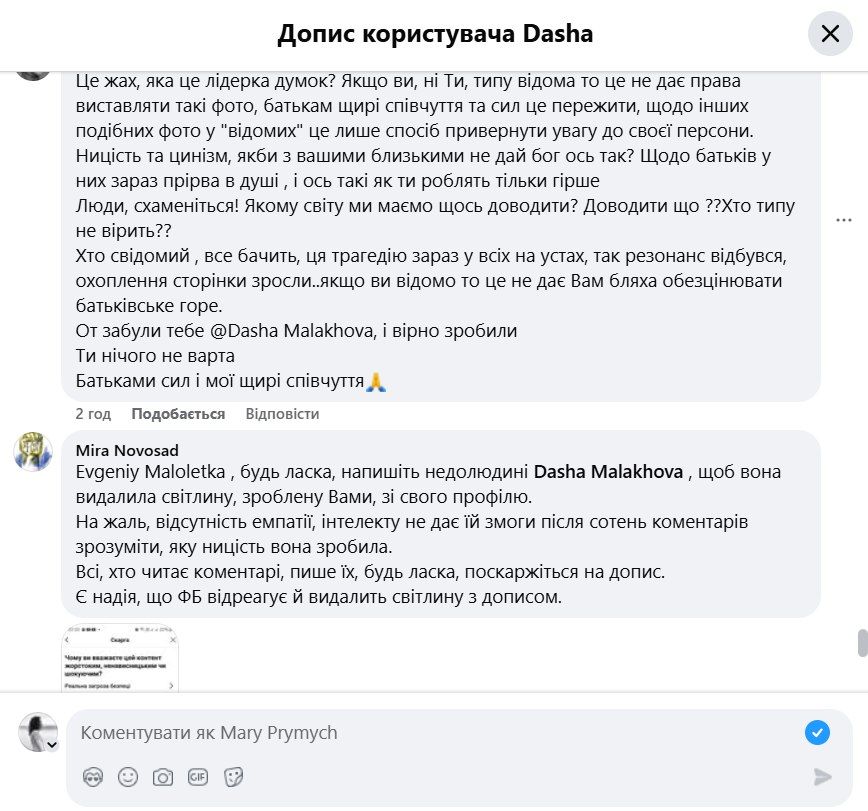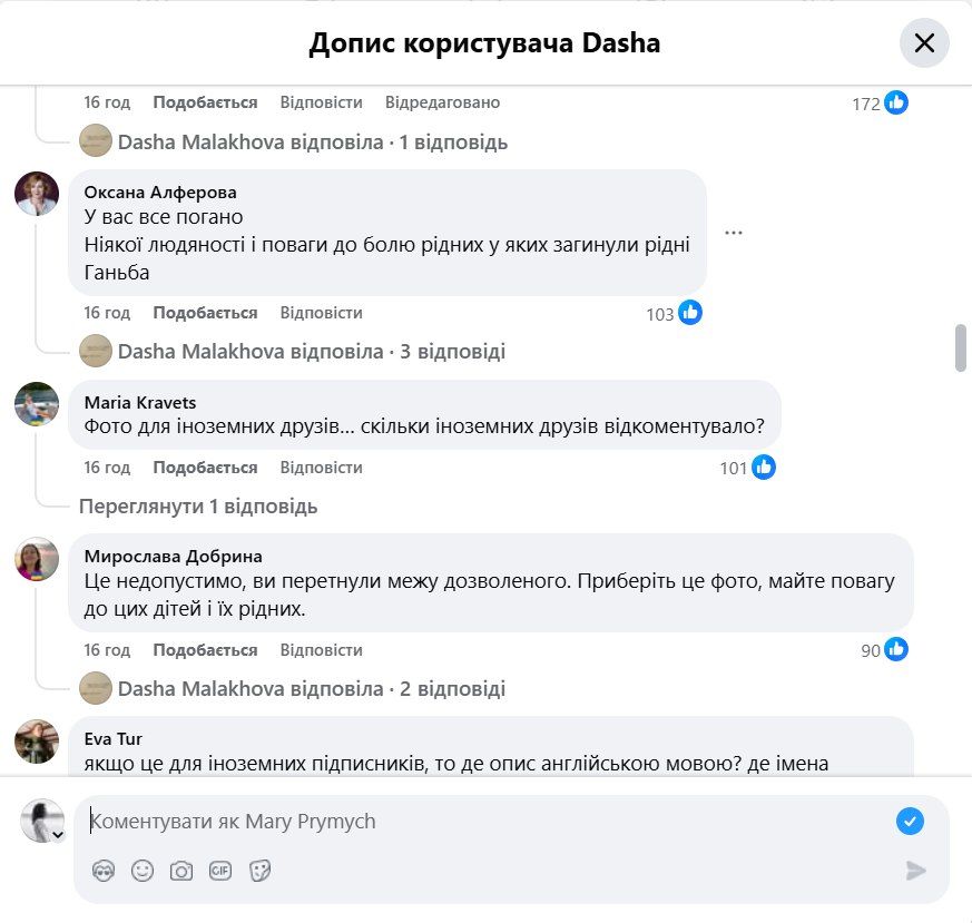 - "В коментарях Малахова розповідає, що зробила це для іноземних читачів. Але це маніпуляція. Допис не англійською мовою. Якщо це до світу, чому не перелічені імена та прізвища загиблих дітей? І Даша не Мадонна чи Джолі, які мають мільйонну аудиторію. Так що тут мимо".
