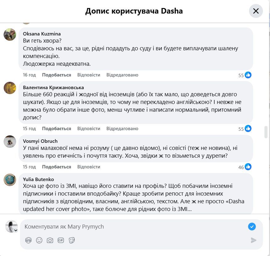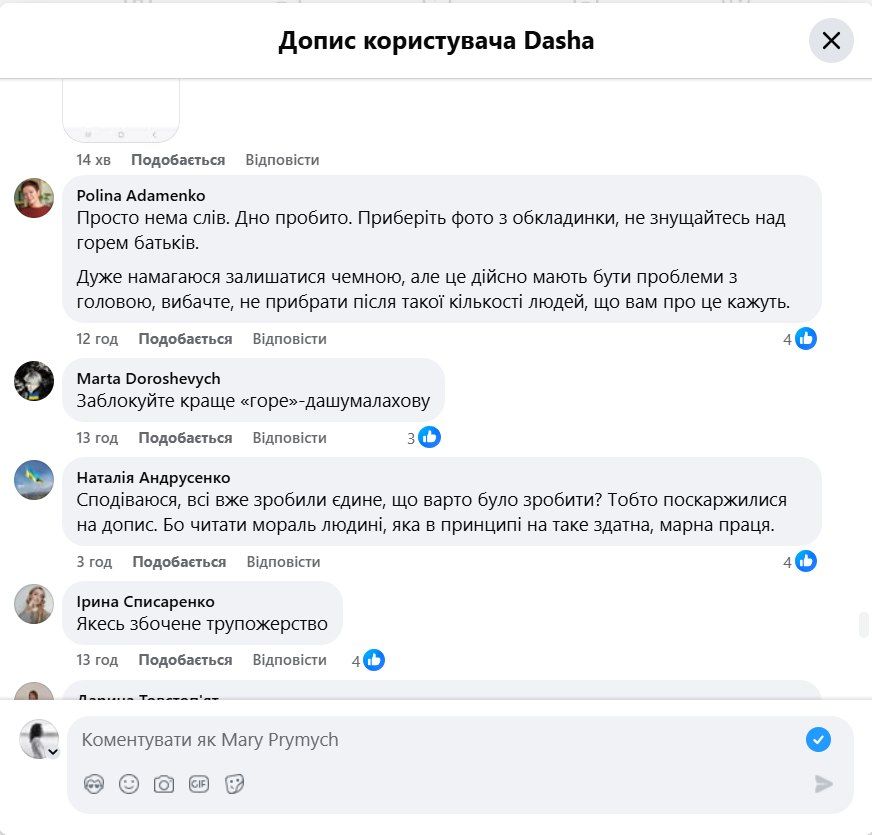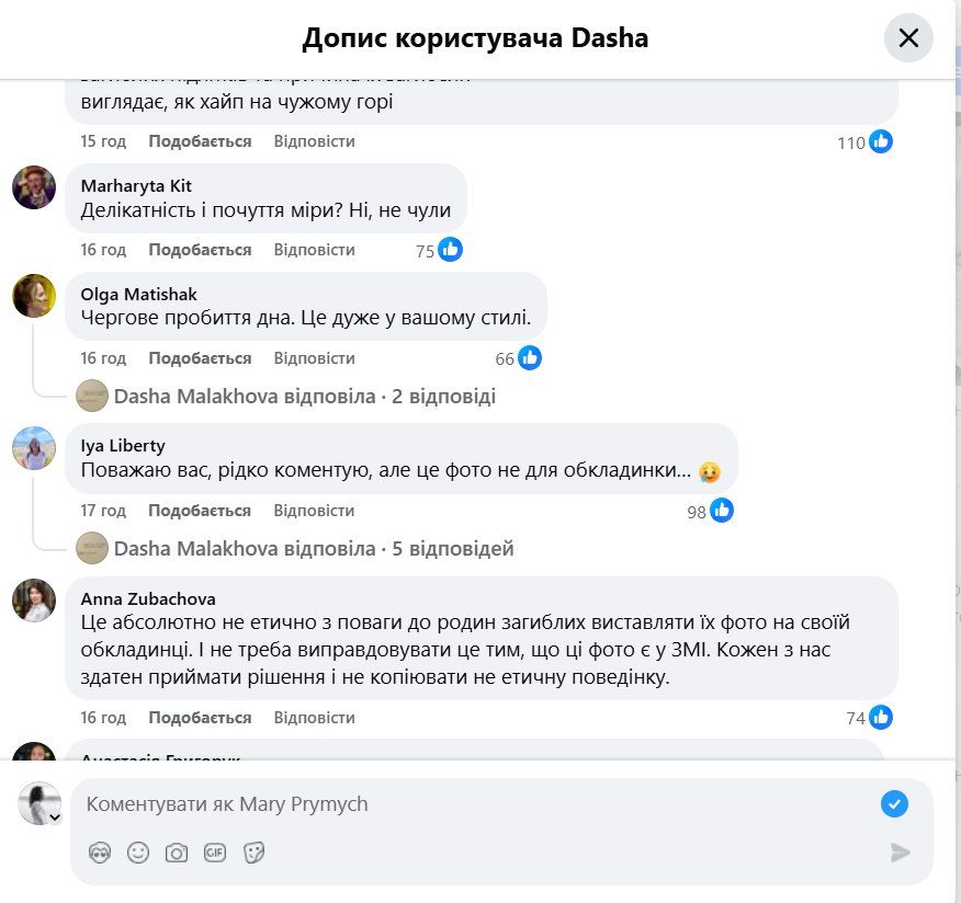- "Просто нема слів. Дно пробито. Приберіть фото з обкладинки, не знущайтеся з горя батьків. Дуже намагаюся залишатися чемною, але це дійсно мають бути проблеми з головою, вибачте, не прибрати після такої кількості людей, що вам про це кажуть".