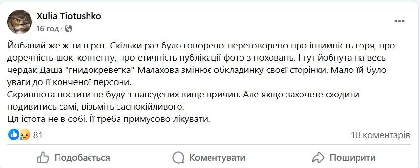 "Це перетин усіх особистих кордонів, це хайпожерство, це нечутливість, це просто жорстоко. Це виглядає, як бажання емоційно поживитись чужою трагедією", – додала Трощинська.