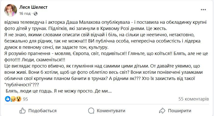 - "Для чого ви запостили інтимне фото чужого горя? Це пробите дно наскрізь. Не можна займатися піаром на трагедіях. Це не просто відсутність критичного мислення – це відсутність мозкових звивин".