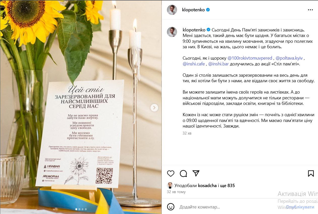Шеф-кухар Євген Клопотенко розповів, що сьогодні його заклади долучилися до акції "Стіл пам'яті". Один столик увесь день зарезервований для тих, хто віддав життя за свободу України.