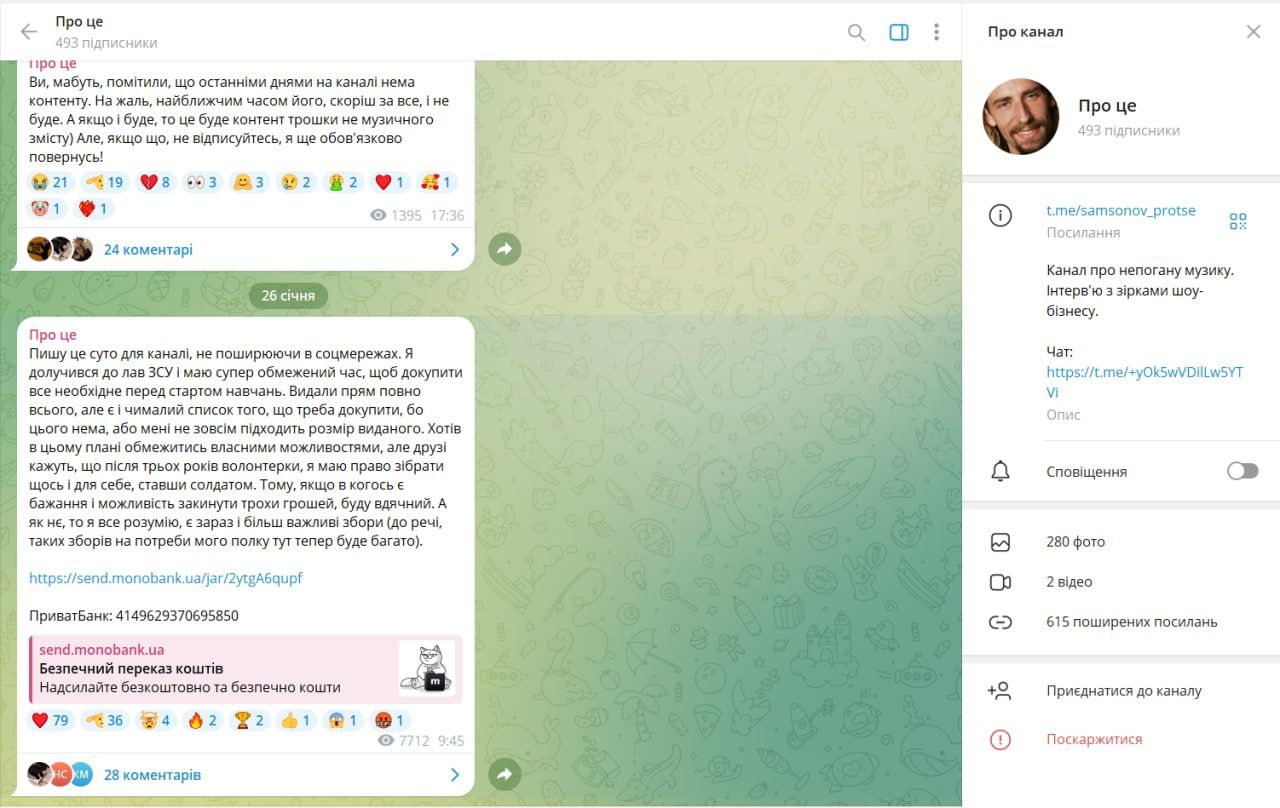- Самсонов закликав шанувальників допомогти зібрати кошти на необхідне спорядження перед військовими навчаннями.