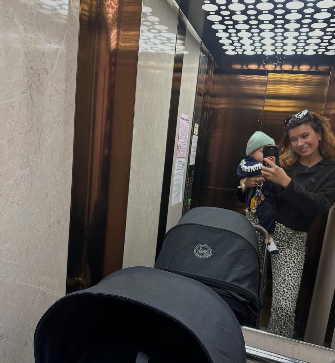 Ірина сфотографувалась з наймолодшим сином у ліфті. Вона тримає Леона на руках і усміхається. Обличчя хлопчика не видно, адже жінка прикрила його телефоном. Поряд з ними стоїть чорна коляска.