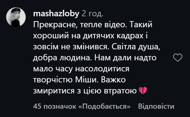 - "Прекрасне тепле відео. Такий хороший на дитячих кадрах і зовсім не змінився. Світла душа, добра людина. Важко змиритися з цією втратою";