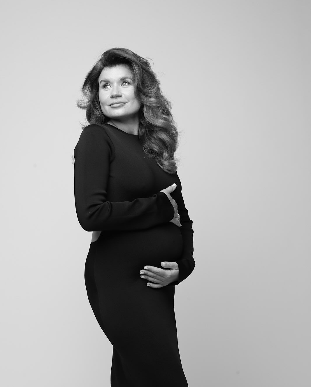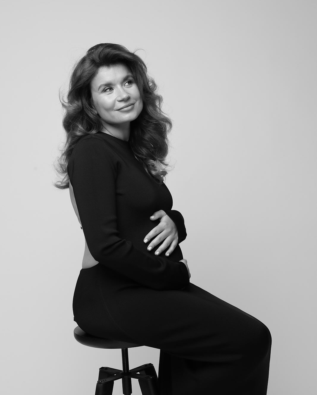 Ірина Монатік позувала перед камерою у довгій чорній сукні з відкритою спиною. Вона обіймала округлий животик та усміхалась.