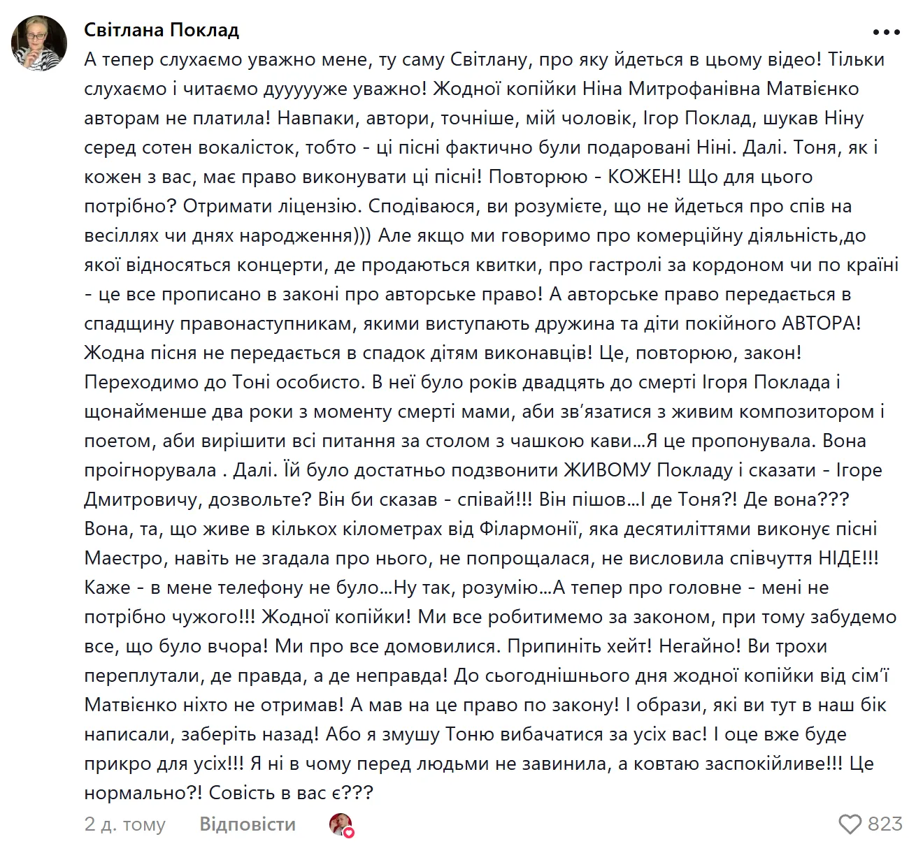 Відео про це з'явилося на тікток-акаунті gopatsa. У коментарях люди відреагували по-різному. Зокрема, виявилося, що не всі зрозуміли, чому Тоня Матвієнко не має права співати пісні, які раніше виконувала її мама. Тож дружина Ігоря Поклада – Світлана написала розлогий коментар під роликом, де виклала своє пояснення.