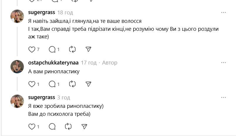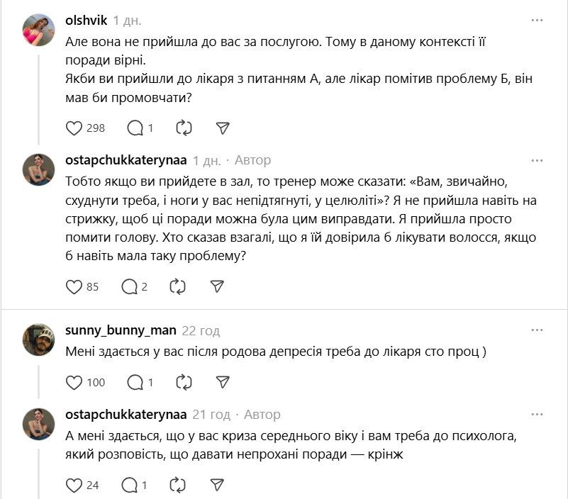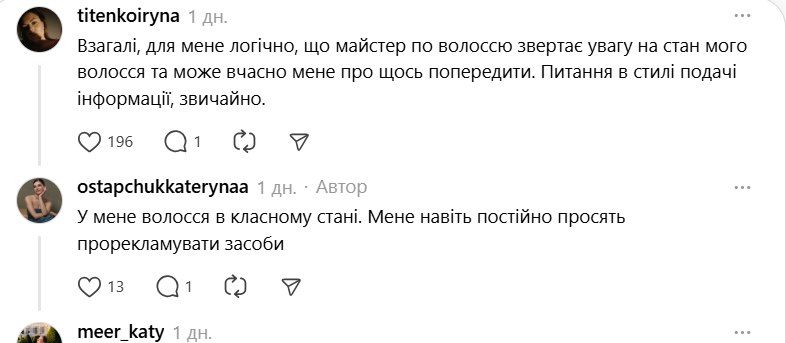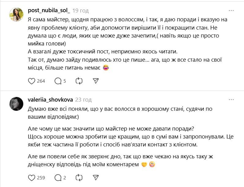 - "Я сама майстриня, щодня працюю з волоссям, і так – я даю поради та вказую на очевидну проблему клієнту, аби допомогти вирішити її й покращити стан. Не думала, що є люди, яких це може дуже зачепити (навіть якщо це просто миття голови). А взагалі дуже токсичний допис, неприємно якось читати".