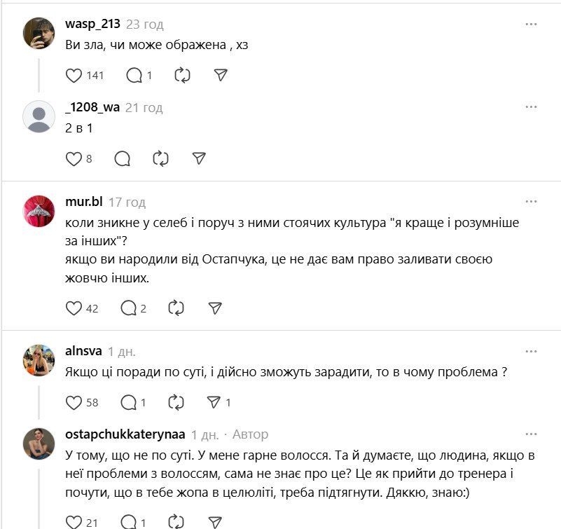 - "Коли зникне у знаменитостей і у тих, хто стоїть поруч з ними, культура "я краща і розумніша за інших?" Якщо ви народили від Остапчука, це не дає вам право заливати своєю жовчю інших".