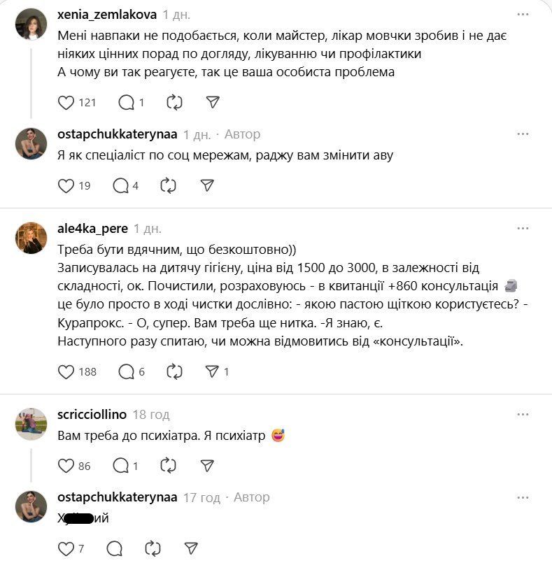 - "Мені навпаки не подобається, коли майстер, лікар мовчки зробив і не дає ніяких цінних порад по догляду, лікуванню чи профілактиці. А чому ви так реагуєте – так це ваша проблема".