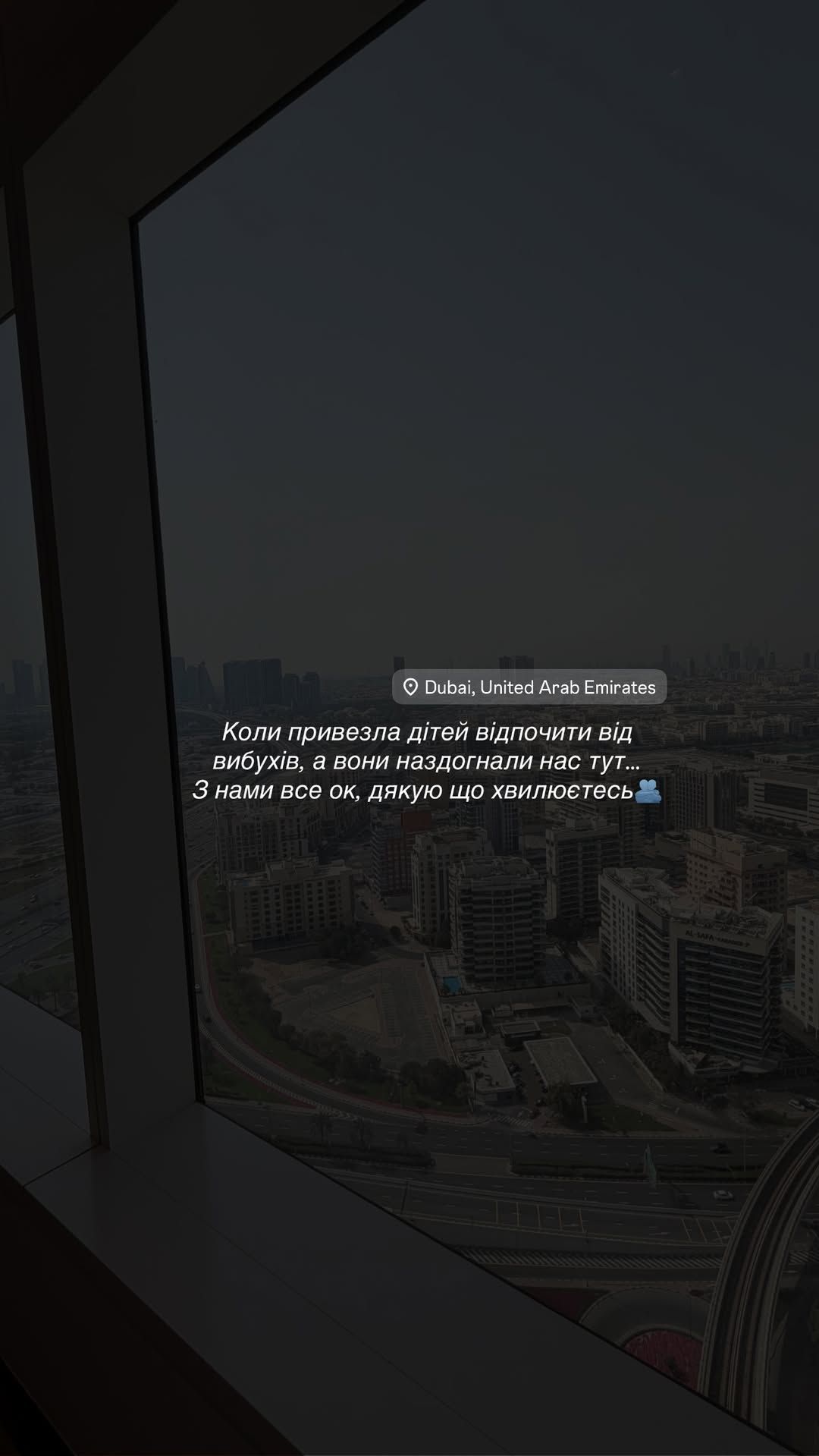 Співачка розповіла, що сподівалась на час відпустки забути про вибухи, але вони наздогнали її й сім'ю в Дубаї. Артистка додала, що з ними зараз все гаразд.
