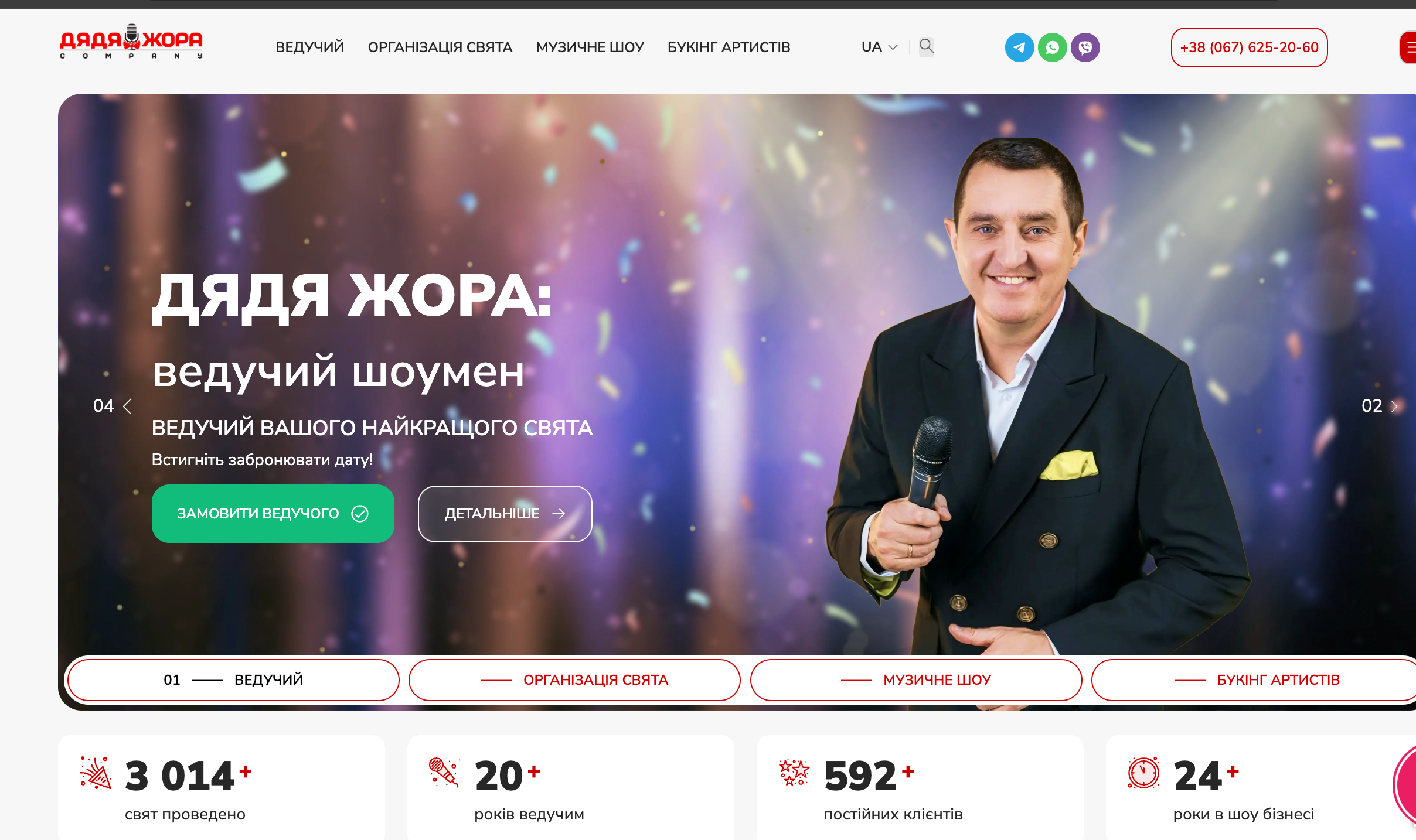 На сайті є можливість замовити собі на церемонію чи будь-який інший захід артистів українського шоубізнесу, гумористів, шоубалет, фотографів і не тільки.