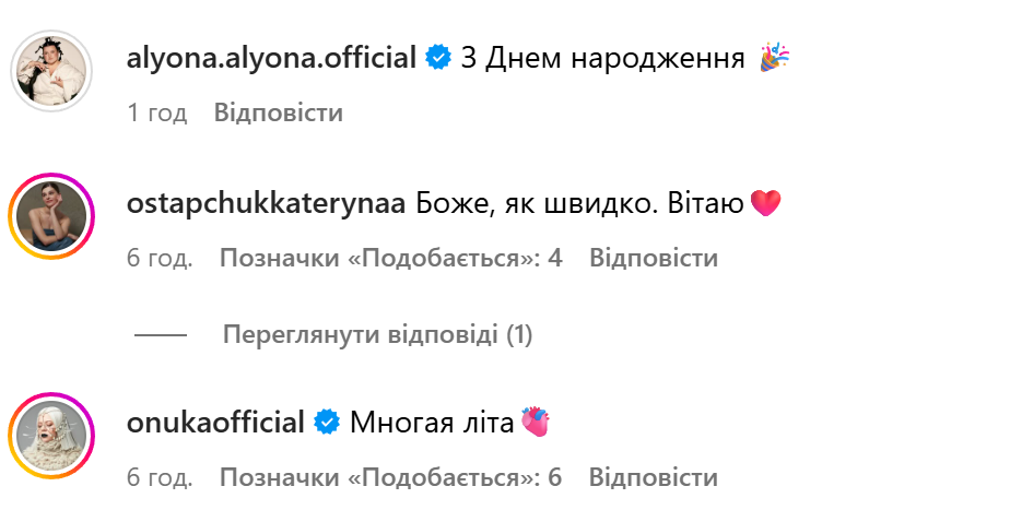 Під дописом співачки з нагоди дня народження Аліма до привітань долучилися зірки українського шоубізу. Серед них – реперка alyona alyona, дружина Володимира Остапчука, дизайнерка Ельвіра Гасанова, артистка KOLA та інші.