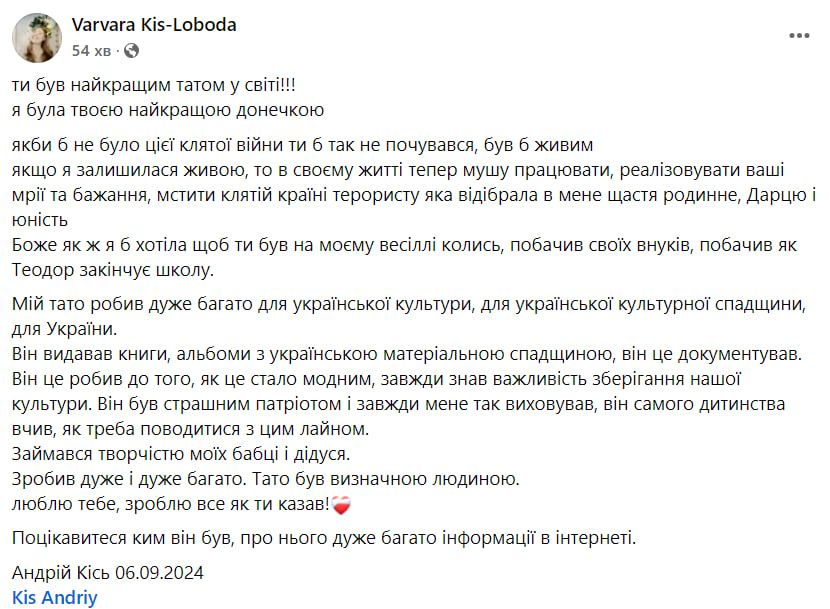 Донька Андрія, Варвара, також опублікувала щемливий допис про батька. Вона зазначила, "якби б не було цієї клятої війни ти б так не почувався, був би живим".