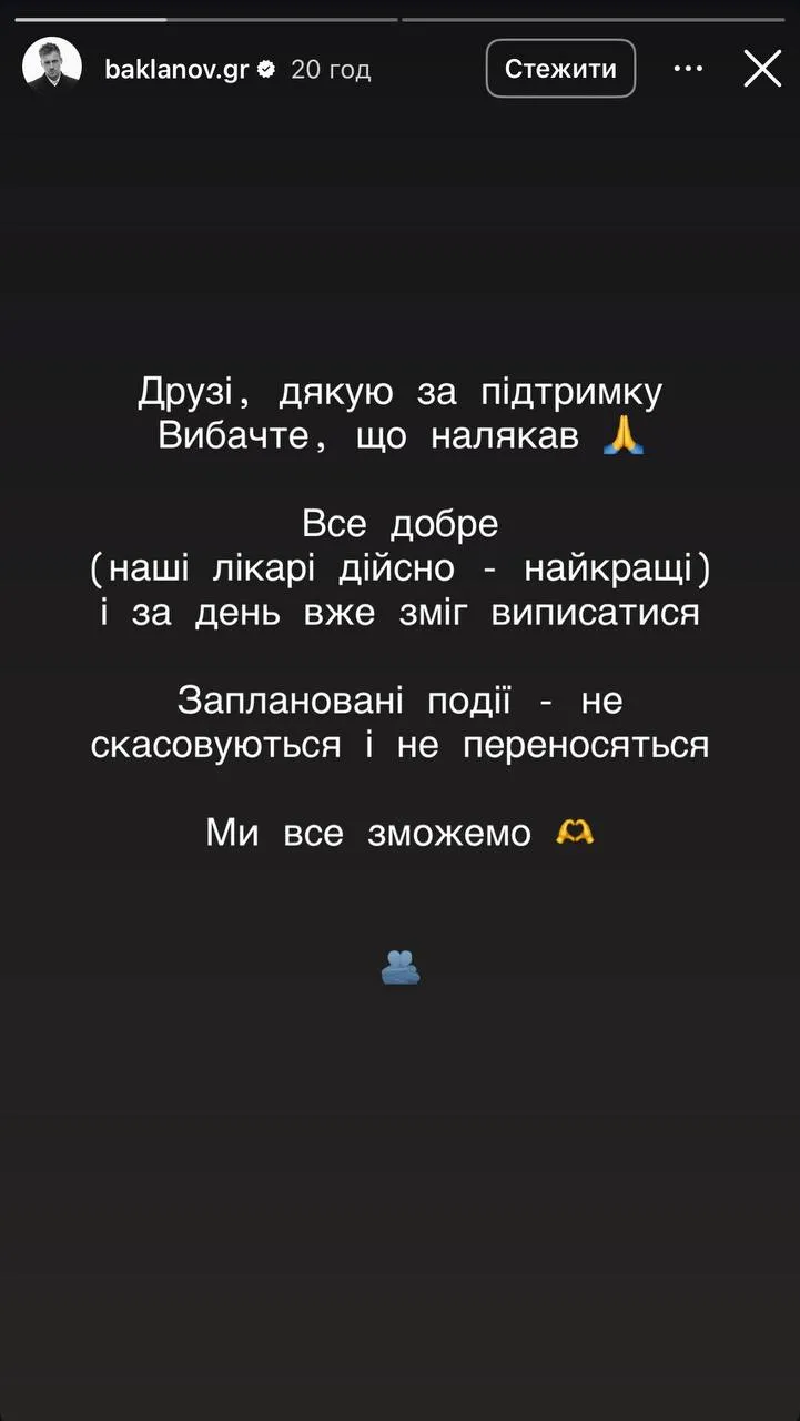 Згодом Бакланов знову вийшов на зв'язок до прихильників і повідомив, як почувається. Пише Show 24 з посиланням на інстаграм актора.