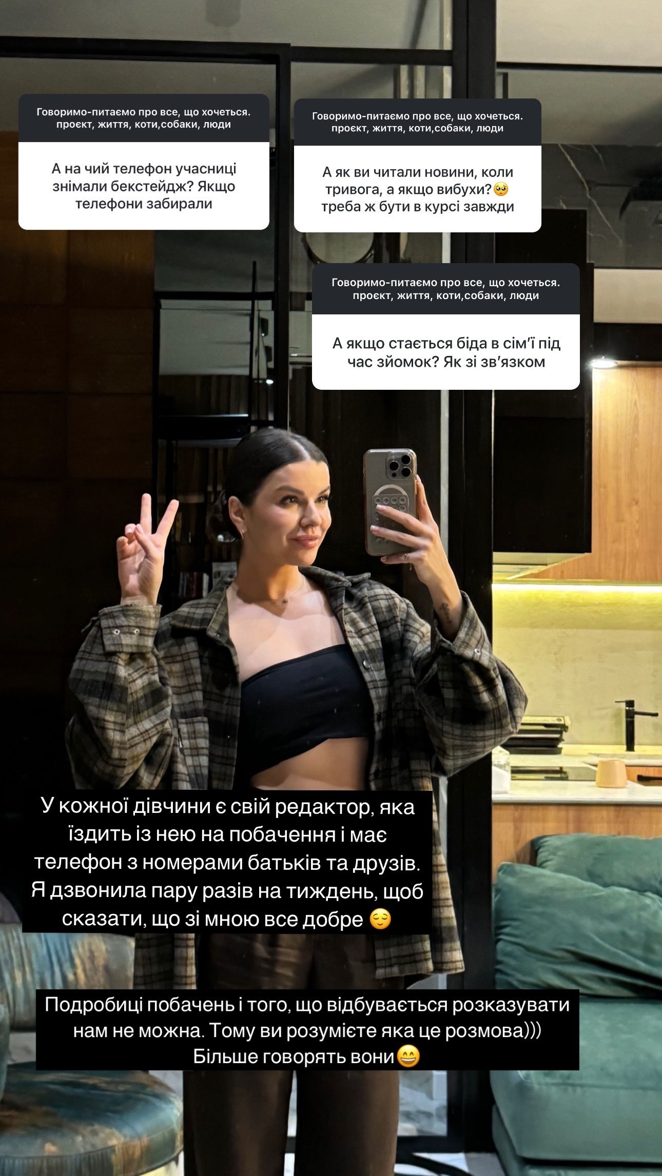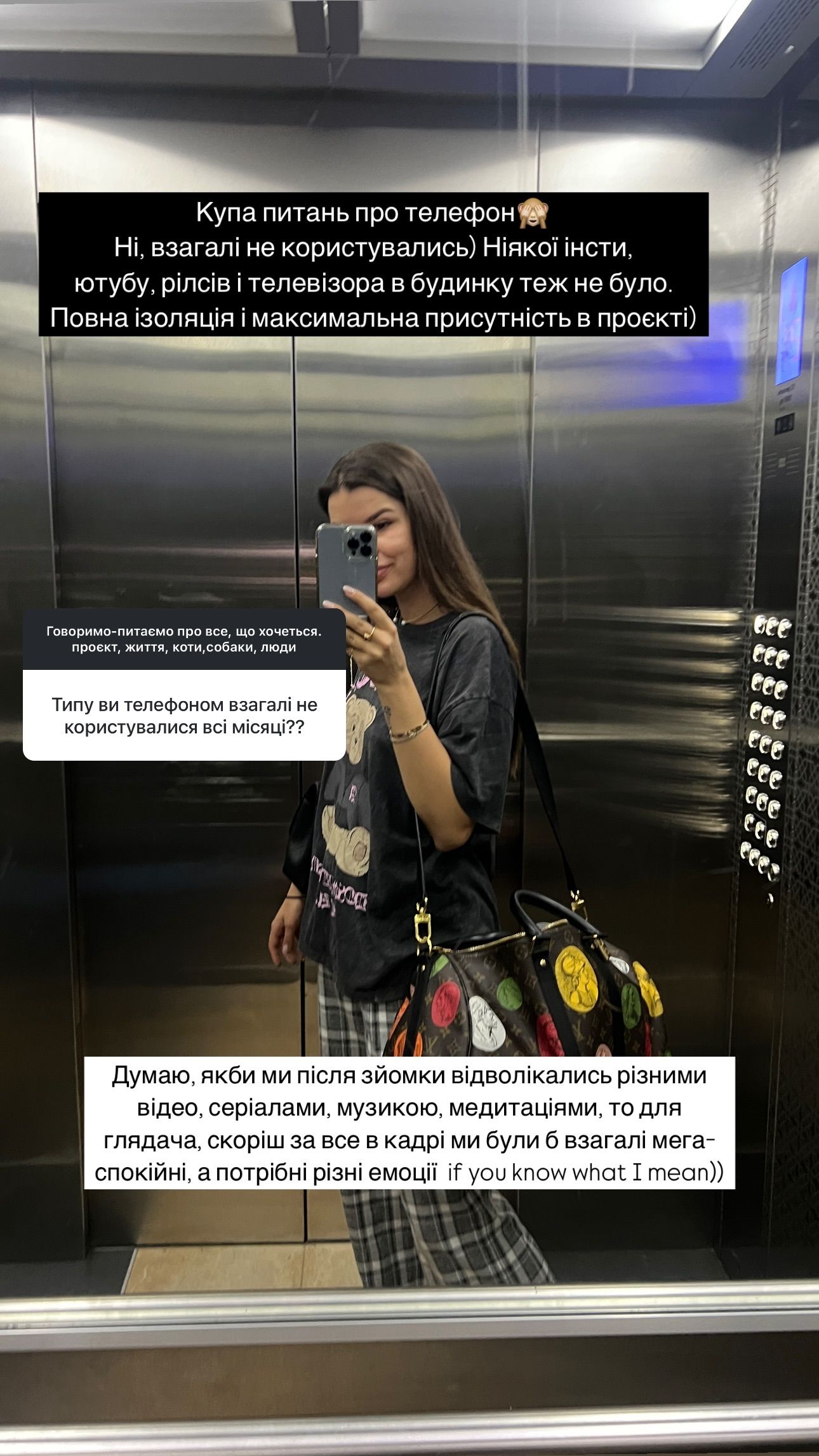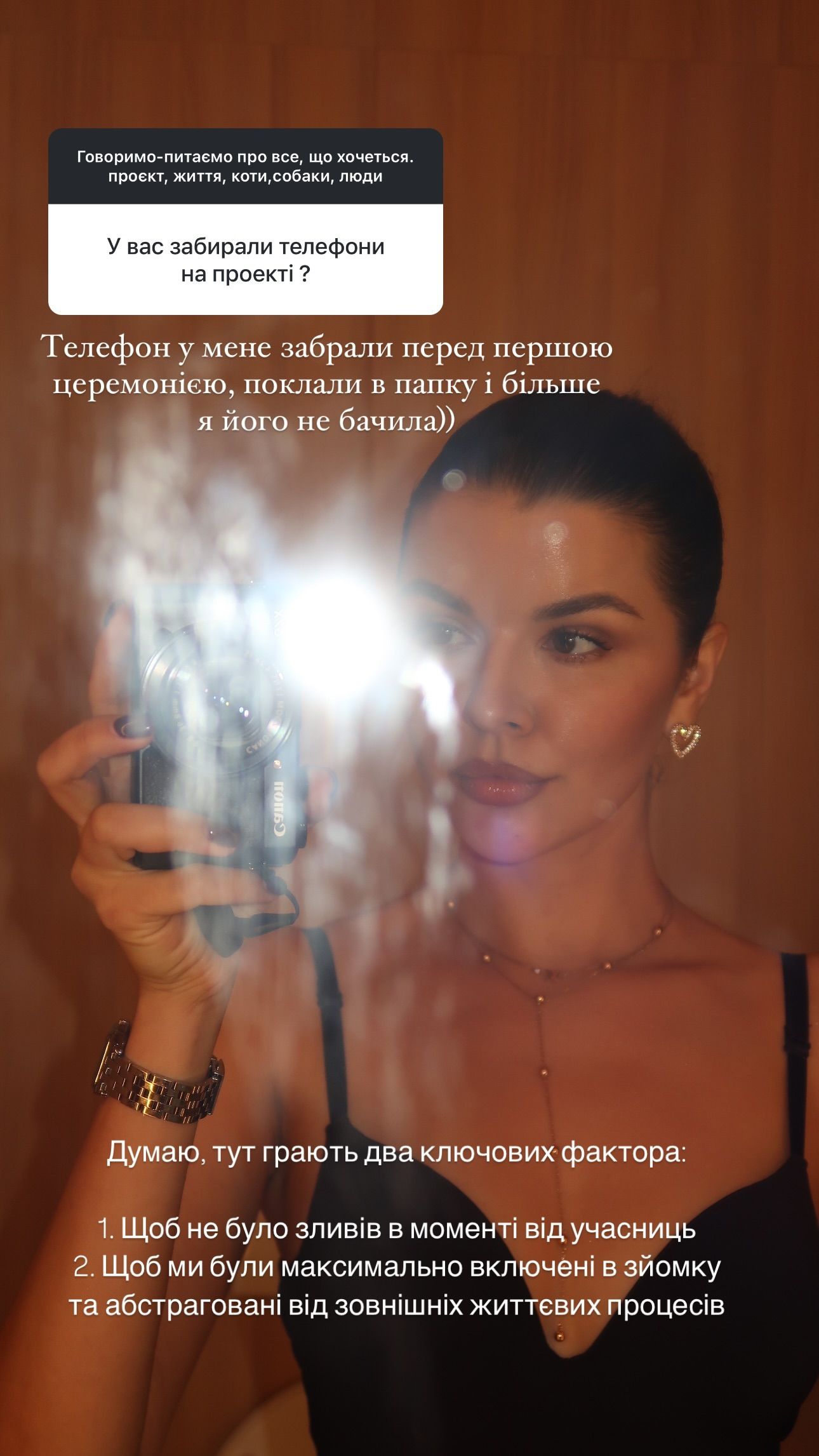 "Купа питань про телефон. Ні, взагалі не користувались. Ніякої інсти, YouTube, і телевізора в будинку теж не було. Повна ізоляція і максимально присутність в проєкті. Думаю, якби ми після зйомки відволікались різними відео, серіалами, музикою, медитаціями, то для глядача, скоріш за все в кадрі ми були б взагалі мега спокійні, а потрібні різні емоції", – додала учасниця "Холостяка".