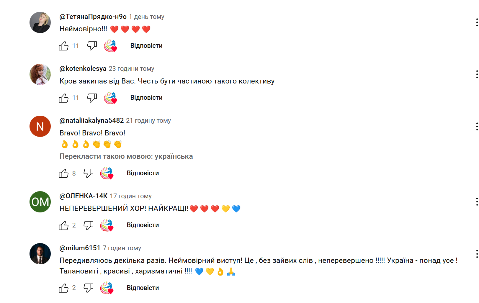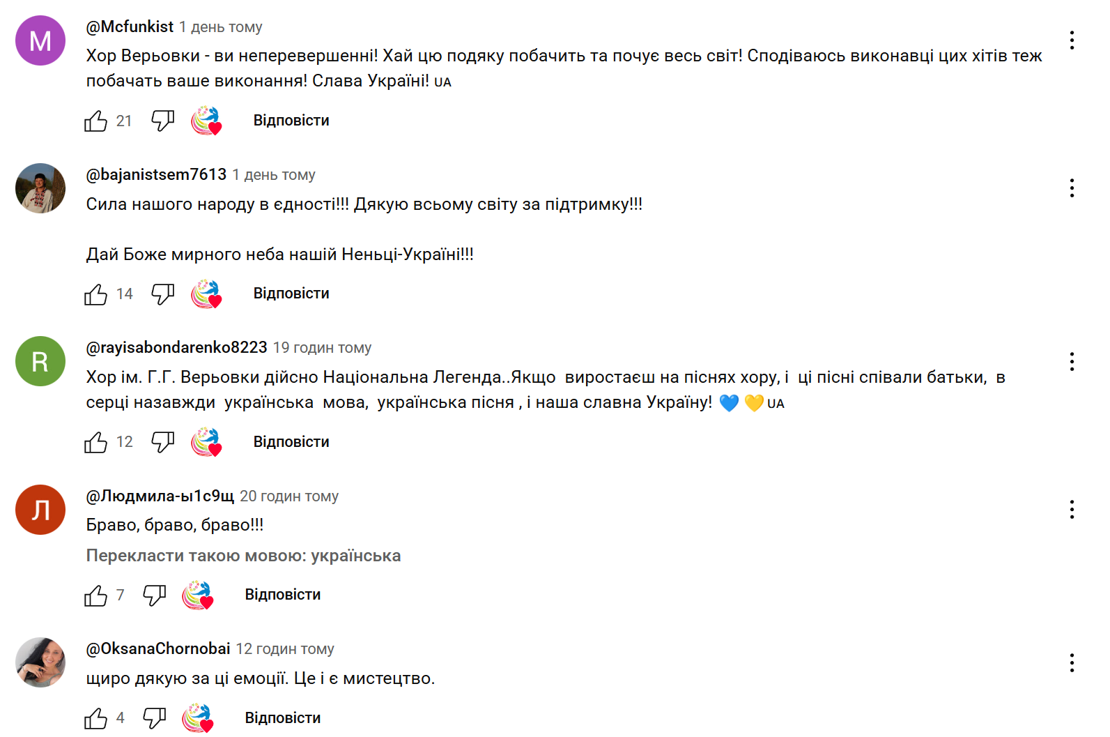 - "Хор Верьовки – ви неперевершені! Хай цю подяку побачить та почує весь світ! Сподіваюсь виконавці цих хітів теж побачать ваше виконання";