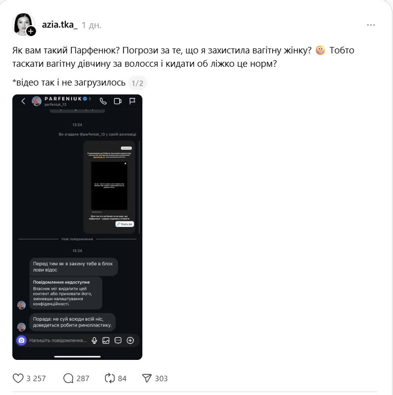 Дівчина розповіла, що отримала погрозу від PARFENIUK, коли стала на захист його колишньої обраниці, блогерки Сімбочки. Річ у тім, що раніше та звинуватила співака у домашньому насильстві.