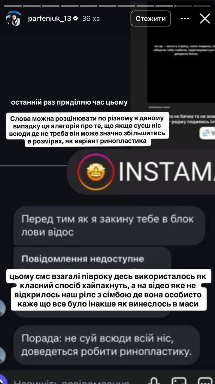 У своєму інстаграмі PARFENIUK розповів, що цьому листуванню приблизно пів року. За словами співака, він надіслав дівчині відео, де Сімбочка говорить, що ситуація була іншою.