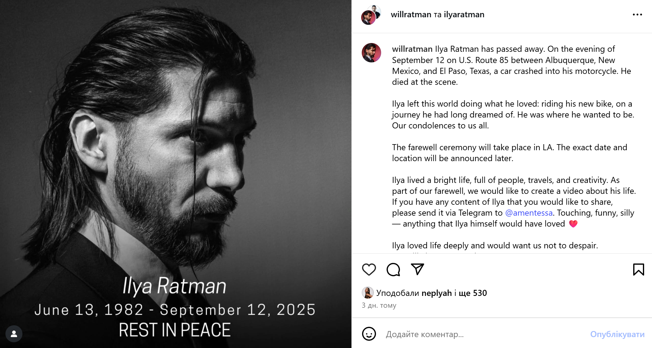 - Ілля Ратман трагічно загинув у ДТП на мотоциклі у США 12 вересня на трасі US 85.