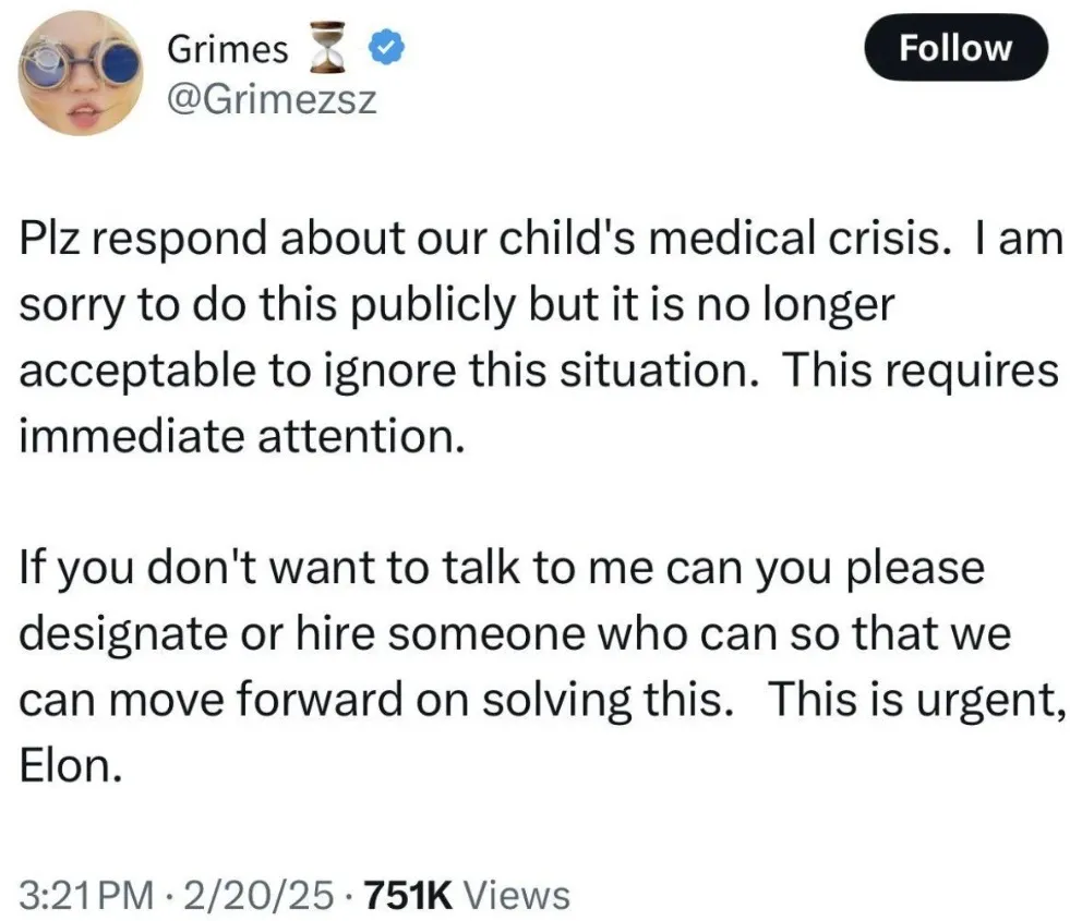 За словами Граймс, вона не може достукатися до Ілона Маска щодо "медичної кризи" у їхньої дитини. Вона не уточнила, про кого з нащадків йде мова, та що саме сталося.
