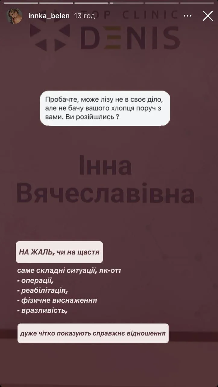 Днями Інна Бєлєнь повідомила, що зробила пластику грудей та підборіддя. Так, у волонтерки поцікавилися, чому коханий не був поряд з нею в цей період. Дівчина натякнула, що вони більше не разом.