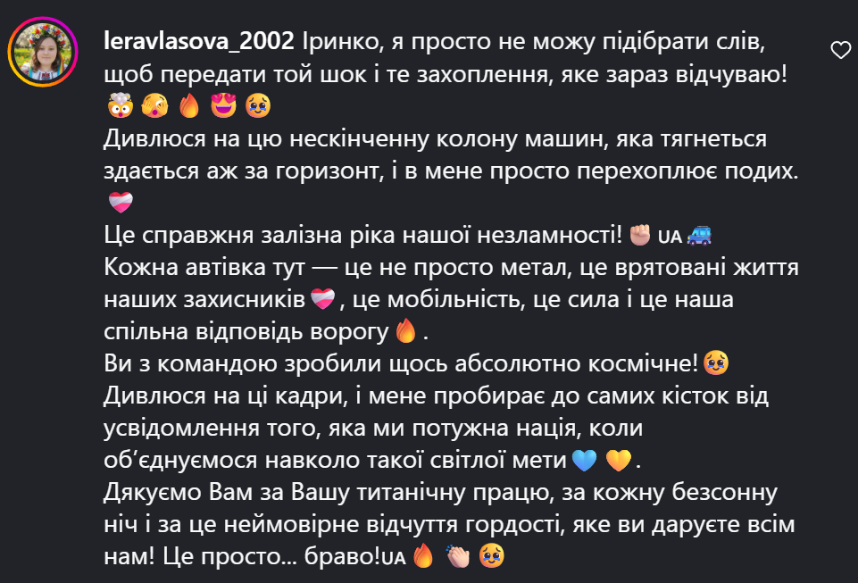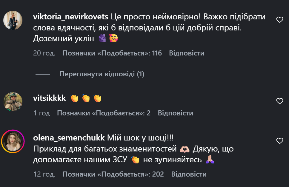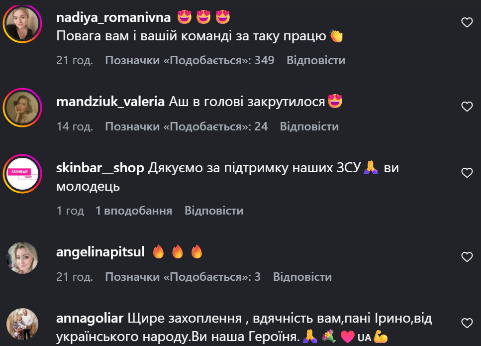 У коментарях під публікацією фанати висловили вдячність Ірині Федишин та її команді за підтримку ЗСУ, назвавши артистку прикладом для інших знаменитостей.