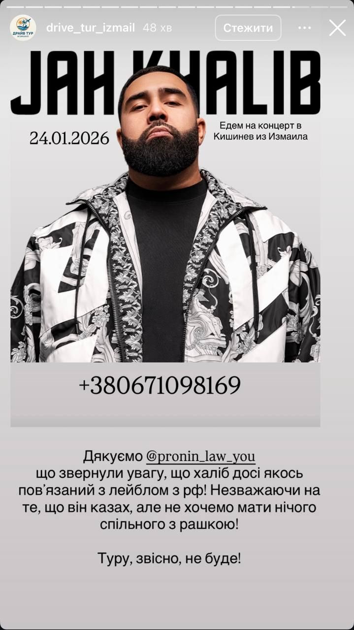 Дякуємо, Євген Пронін, що звернули увагу, що Jah Khalib досі якось пов'язаний з лейблом із РФ. Попри те, що він казах, але не хочемо мати нічого спільного з Росією! Туру, звісно не буде,