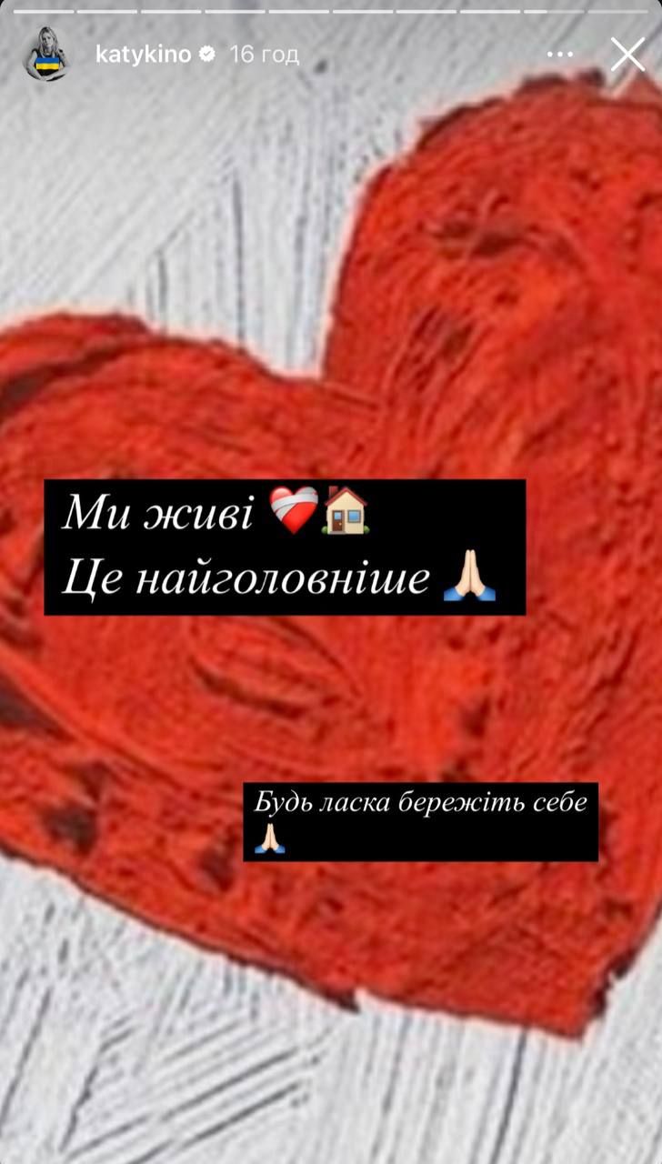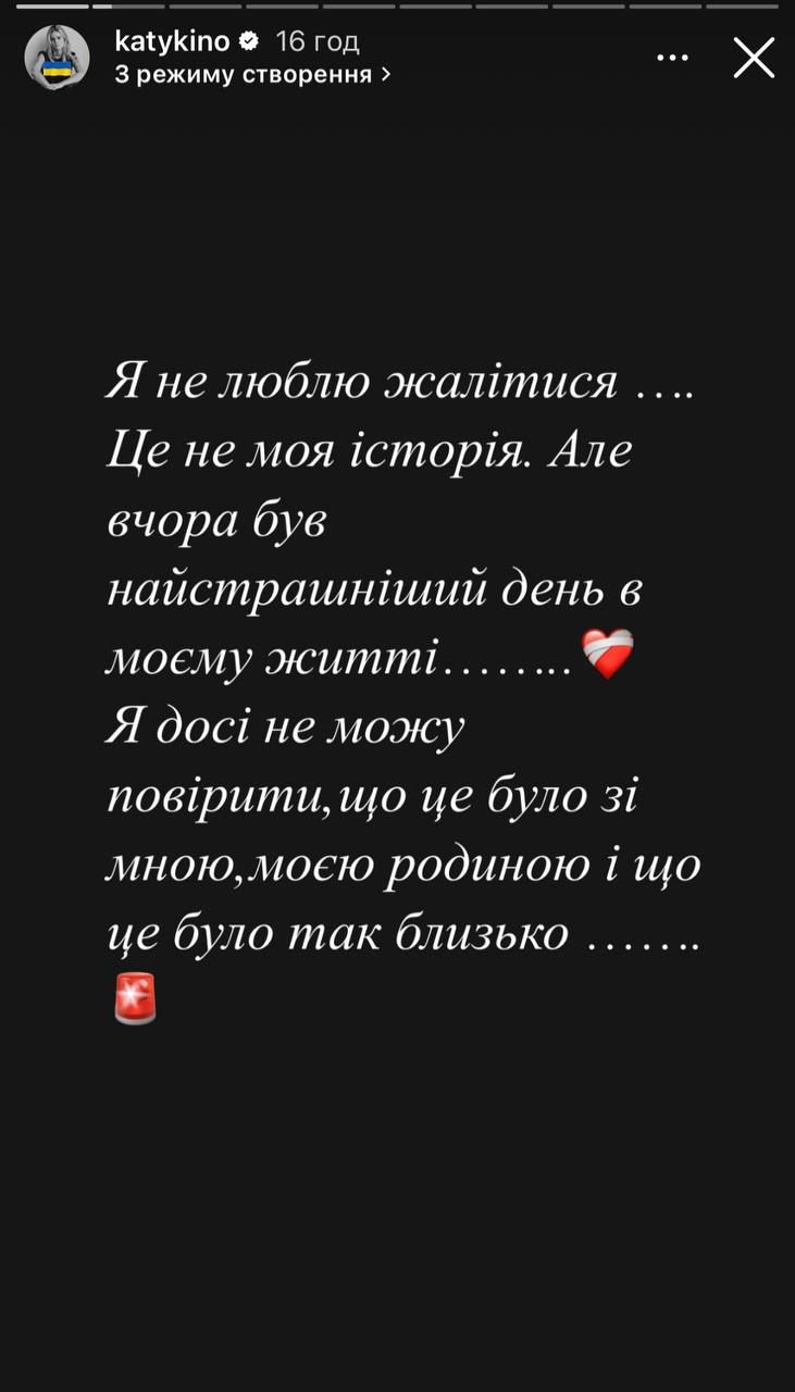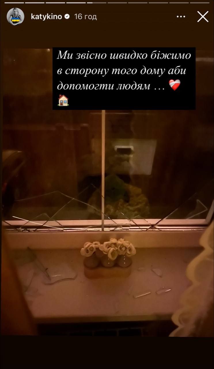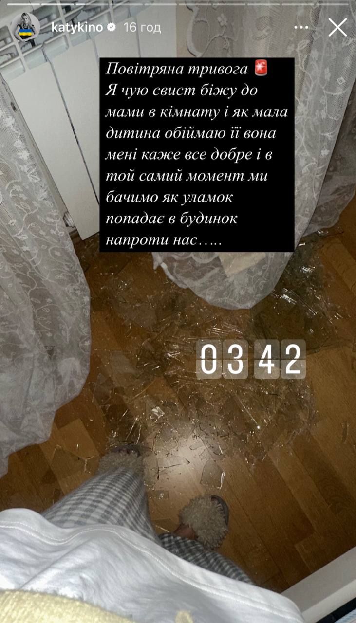 Як виявилося, під час повітряної тривоги Катерина перебувала у квартирі батьків. Коли почула гучний свист за вікном, інстинктивно побігла до матері. Жінки обійнялися, і в той самий момент у сусідній будинок влучив уламок повітряної цілі. В оселі, де була акторка, повилітали вікна, а скло розлетілося на друзки по підлозі.