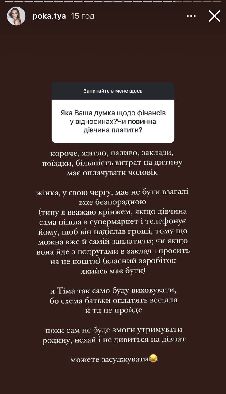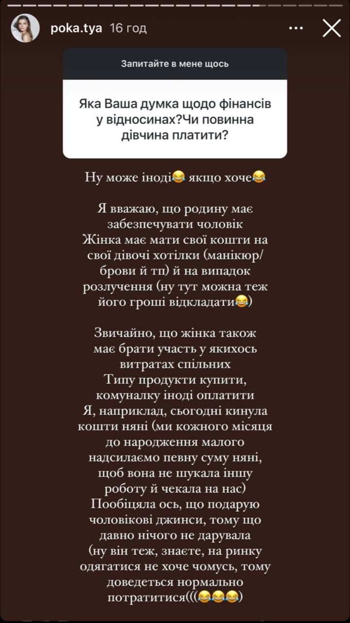 Зокрема, Катерина відверто зізналася, хто за що платить в їхній сім'ї. Про це вона розповіла в інстаграм-сторіс, коли її запитали підписники.