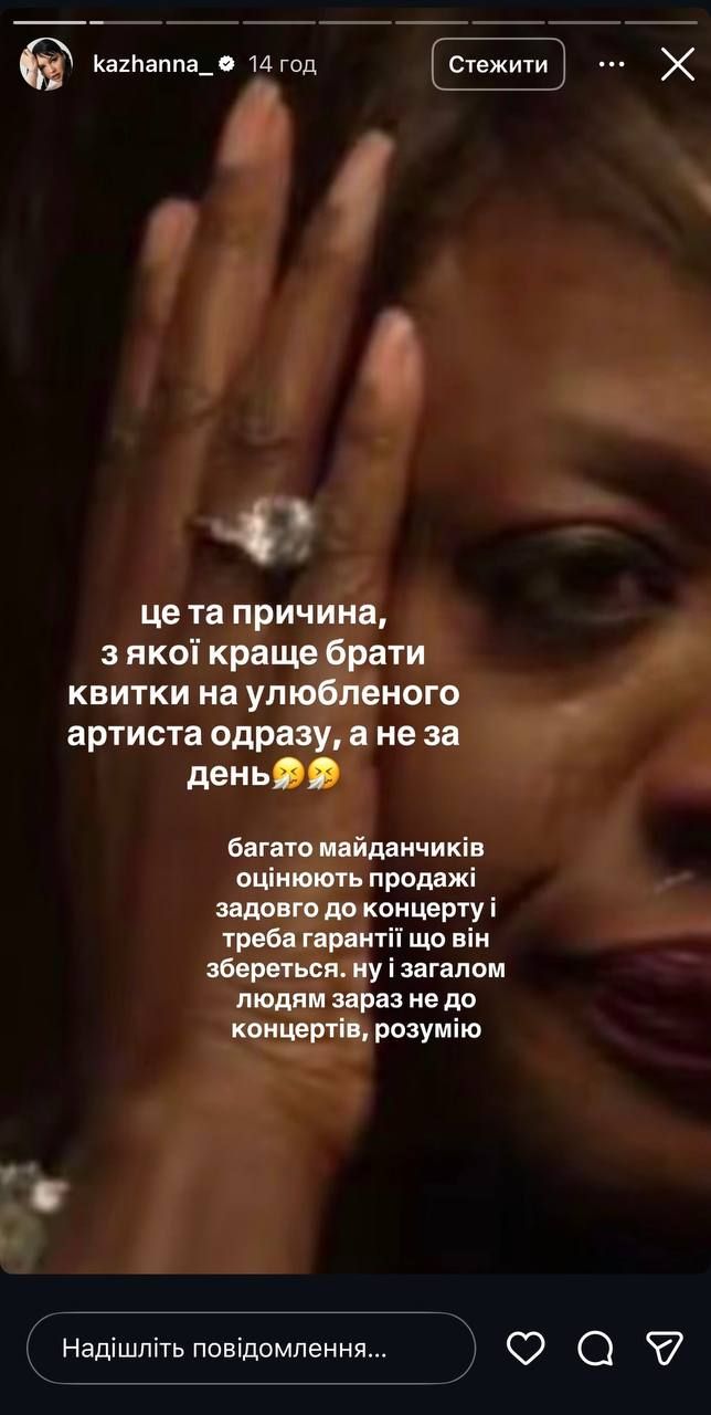 Пізніше у сториз співачка зізналась, що не виступить у трьох містах України через низькі продажі квитків.