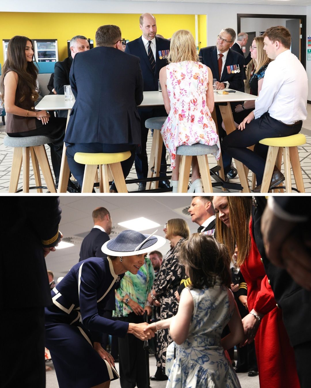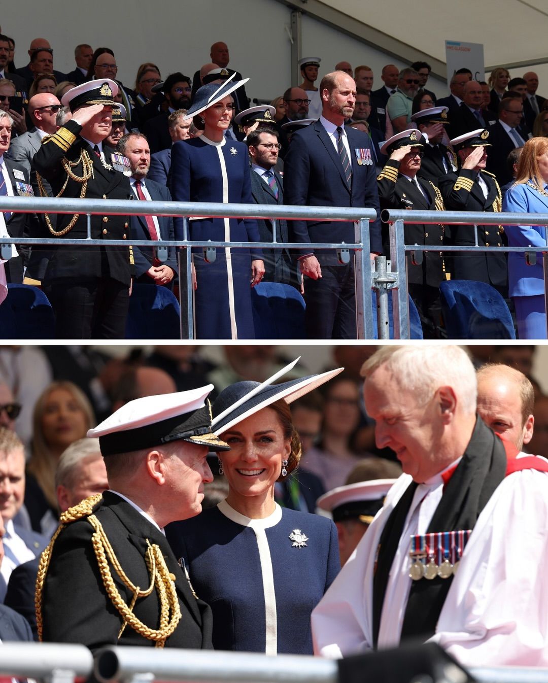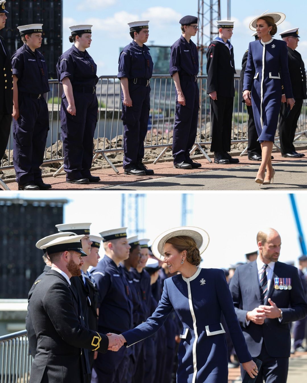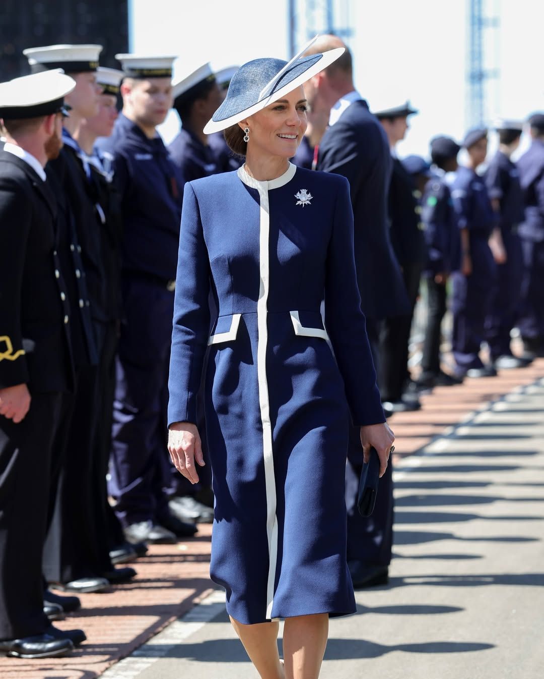Для події Кейт Міддлтон обрала сукню-пальто темно-синього кольору з білими вставками від Suzannah London. Свій образ вона доповнила капелюшком від Philip Treacy. Сукня приталена, довжини міді та має довгі рукави.