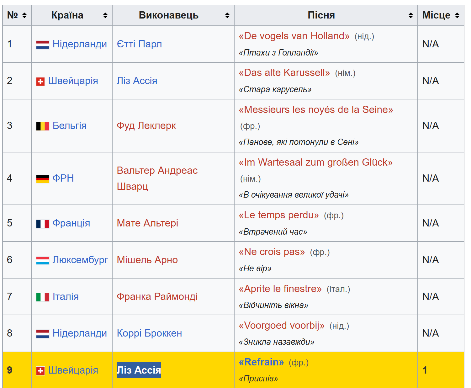 Переможницею стала представниця Швейцарії Ліз Ассія з піснею Refrain.