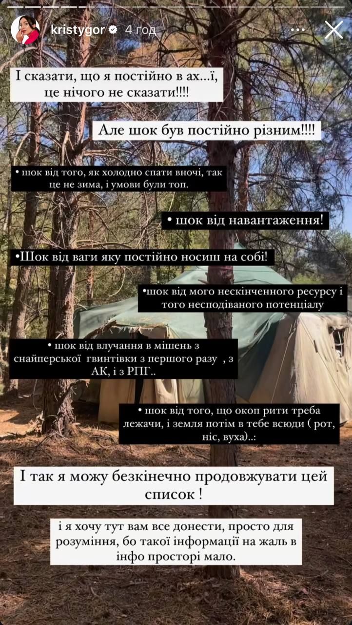 Я постійно в а*уї… Шок був постійно різним. Шок від того, як холодно спати вночі, але це не зима й умови були топ. Шок від навантаження. Шок від ваги, яку постійно треба носить із собою. Шок від влучання в мішень. Шок від того, що окопи треба рити, лежачи на землі, земля потім у тебе всюди. І так можу нескінченно проводжувати список,