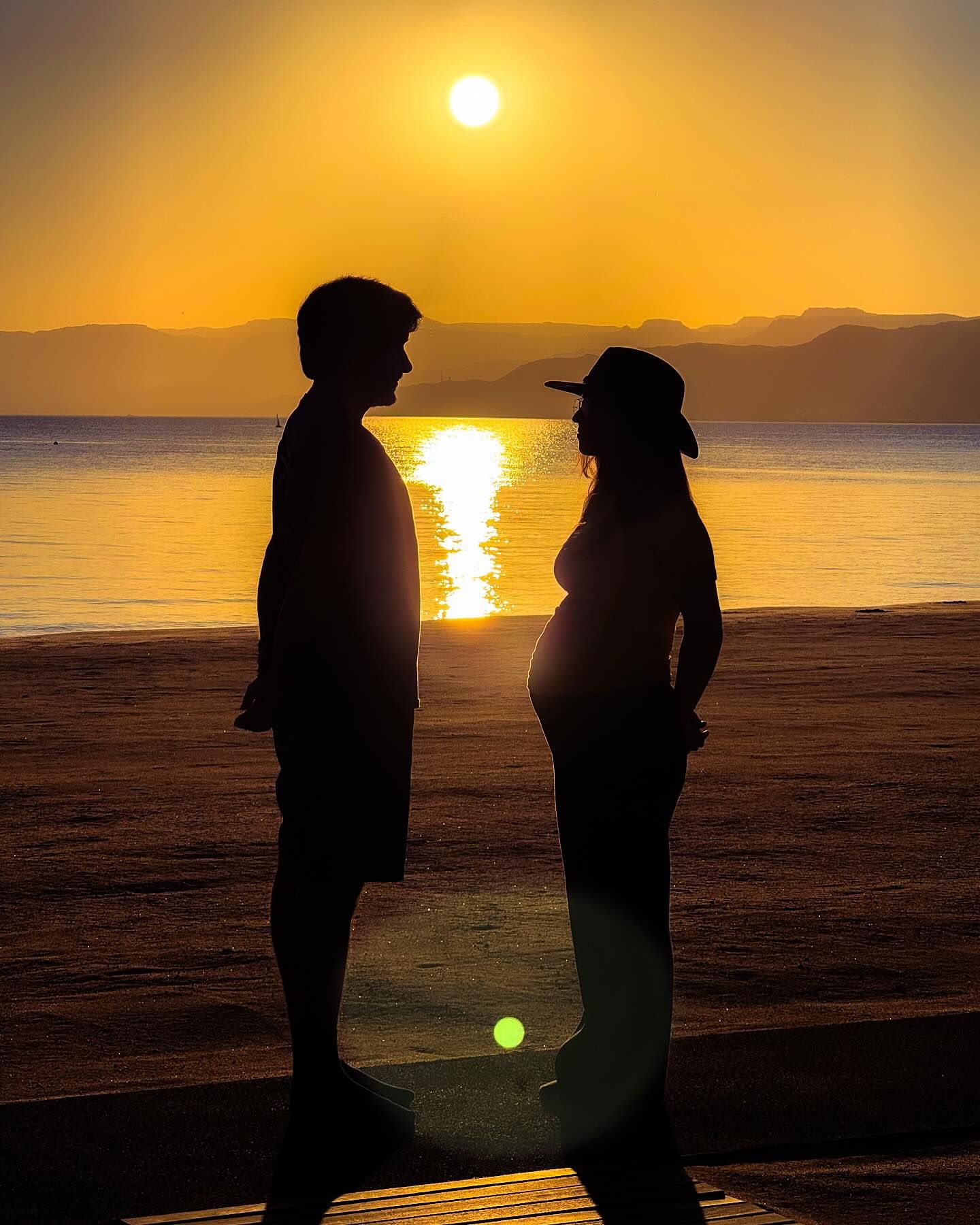 Принцеса Іман бінт Абдулла позувала перед камерою разом з чоловіком на тлі моря та заходу сонця. Пара повернулась одне до одного обличчям, тож світло підкреслювало округлий животик принцеси.