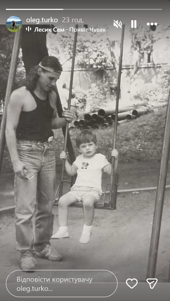 На світлині Олег ще маленький сидить на гойдалці, а поруч стоїть його молодий батько, одягнений у майку та джинси.