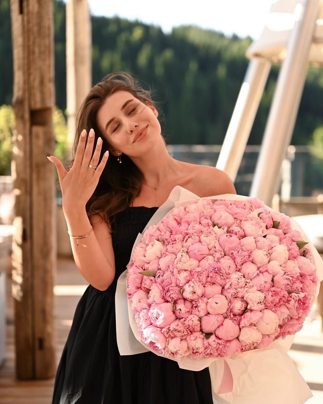 Юліана опублікувала фото з розкішним букетом рожевих півоній, а також продемонструвала каблучку, яка стала символом освідчення Сергія.