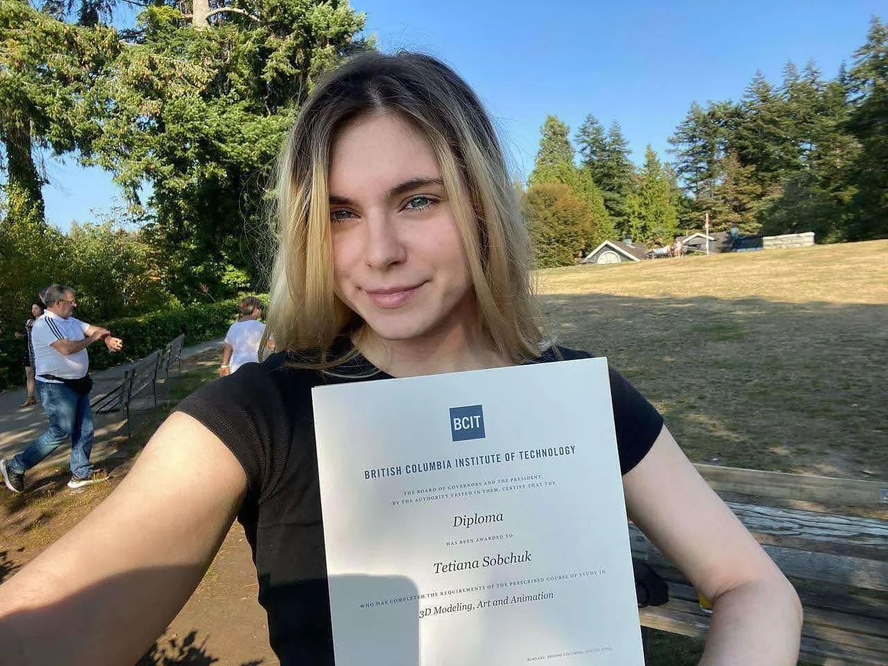 Олег Собчук опублікував рідкісне фото іменинниці. Вона зробила фото з дипломом про завершення освіти. Виявилося, що Тетяна навчалась у Канаді в університеті British Columbia Institute of Technology за спеціальністю "3D моделінг, графіка та анімація".
