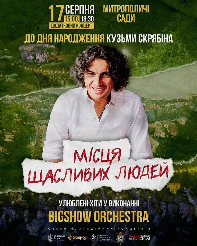 - У Львові 17 серпня відбудеться концерт "Місця щасливих людей" з нагоди дня народження Андрія Кузьменка, де будуть виконані хіти "Скрябіна" струнним оркестром, рок-бендом і солістами.