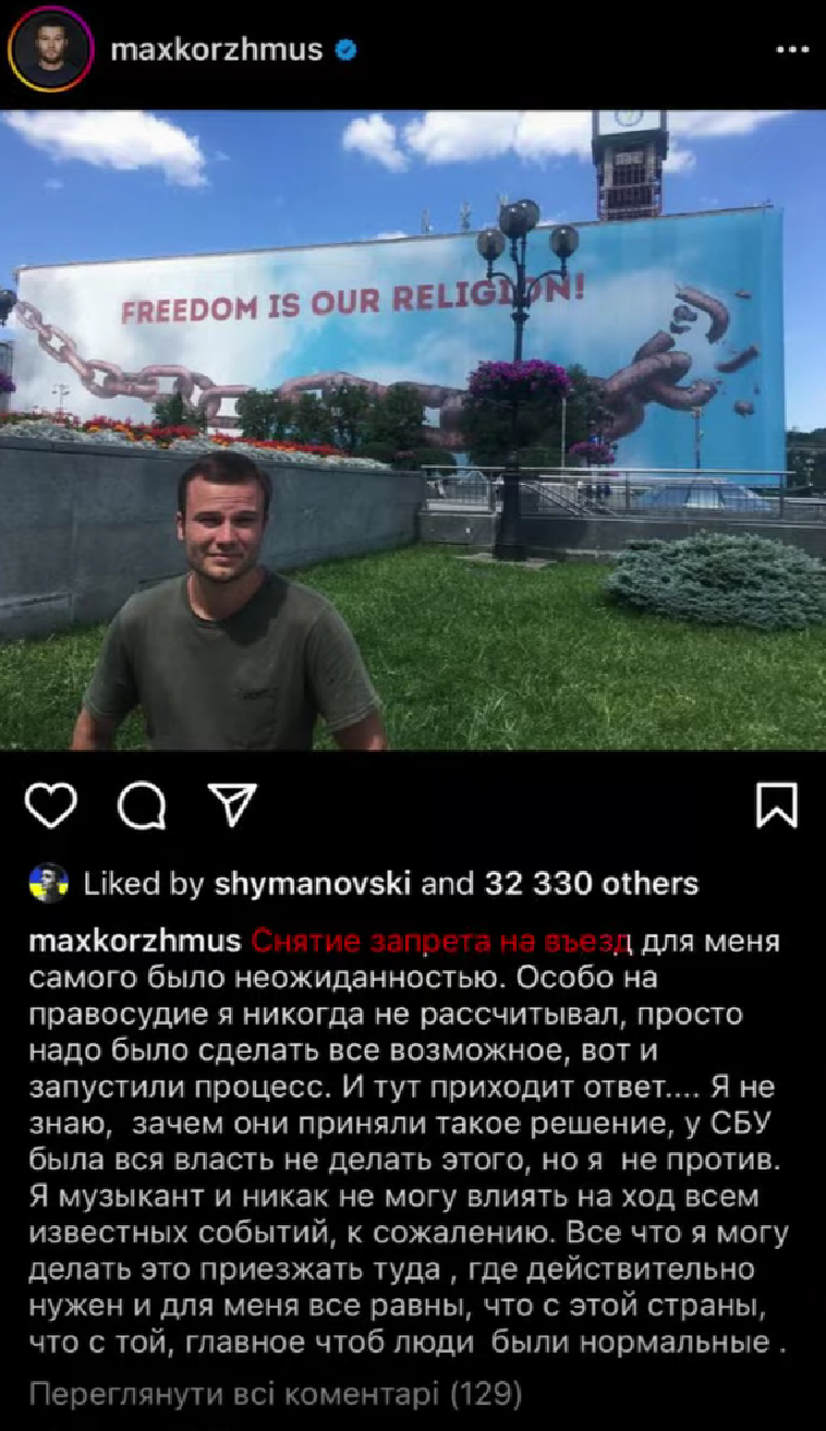 Заборону зняли у 2017-му, і Макс Корж виступив у Києві та Одесі. Водночас у соцмережах він тоді продовжував писати про те, що просто музикант, який ніяк не може вплинути на "перебіг всім відомих подій", де мав на увазі російсько-українську війну.